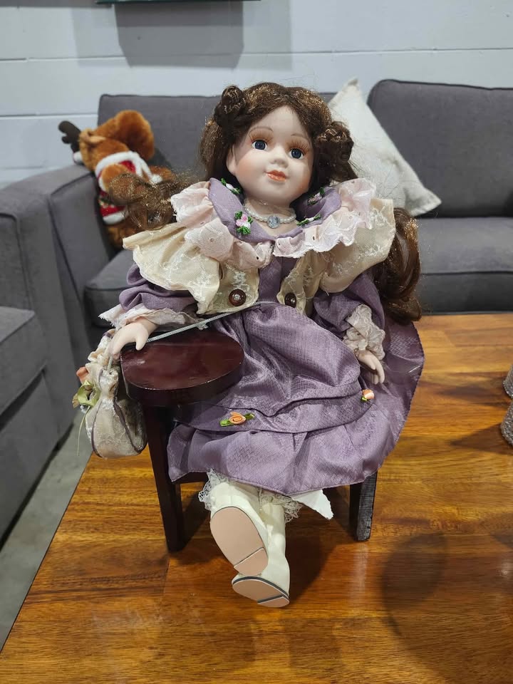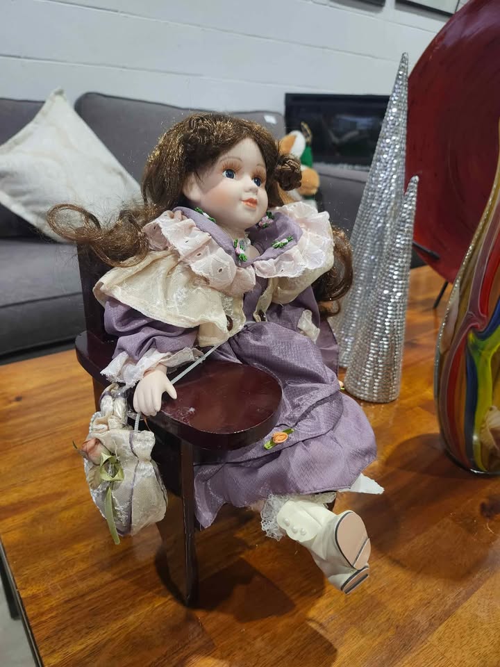 Not really sure too much about this item! She's made of porcelain and is sat on a little desk :)