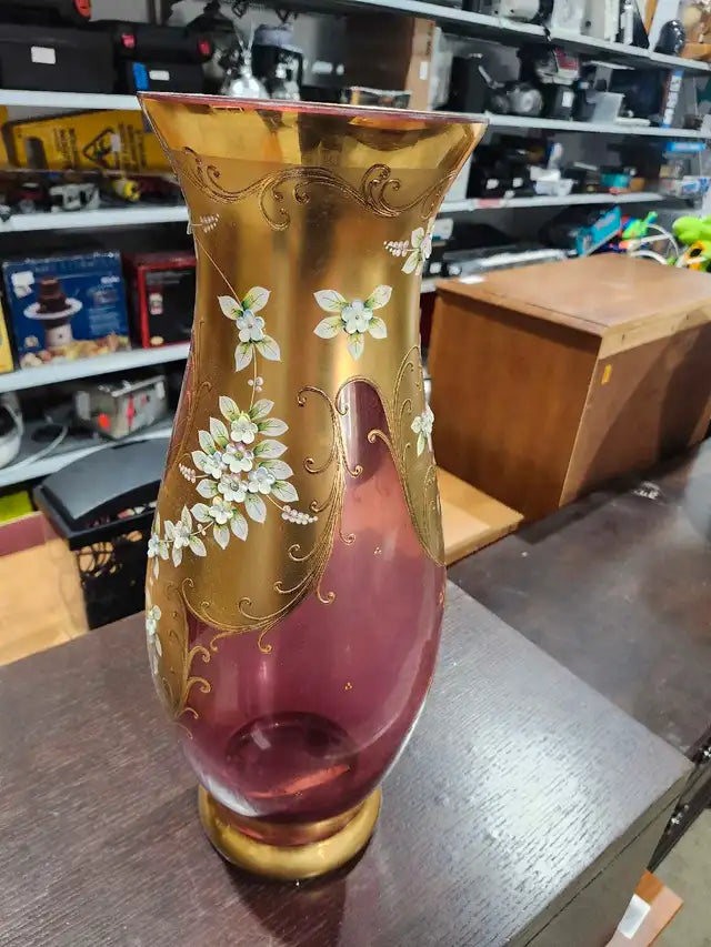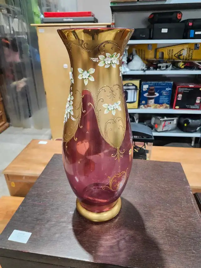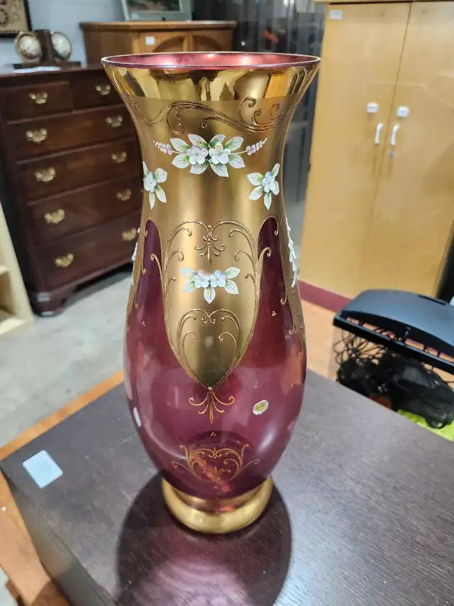 Add a touch of elegance to your home with this beautiful Bohemian vase featuring gold accents and delicate floral designs! This eye-catching decorative piece stands approximately 21 inches tall and showcases exquisite craftsmanship. This vase is in good condition and would make a lovely addition to any room. Additional details: * Height: 21 inches * Material: Glass with gold accents * Design: Floral with intricate detailing 6215 3rd St SE, Unit C11 - Rebound Centre Daily 10 AM – 5 PM Local pickup/Delivery available (for a fee depending on location/item). Feel free to drop us a message or visit us in store. Prices subject to GST See more at Reboundcentre.com
