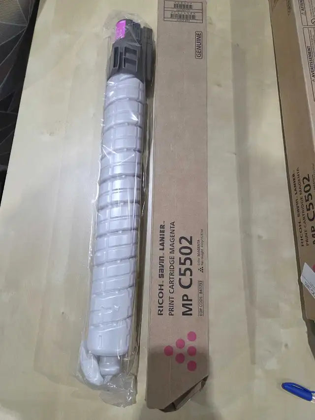 I'm selling two new, genuine Ricoh, Savin, Lanier MP C5502 magenta print cartridges. These cartridges have a net weight of 450g/15.87oz and are ready to bring vibrant colour to your printing needs.