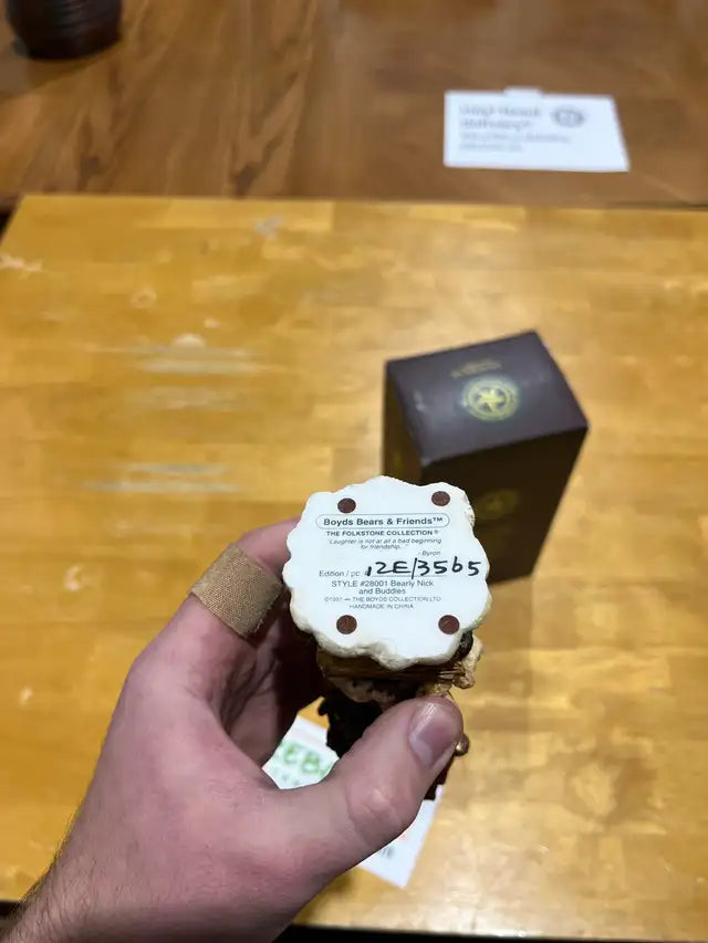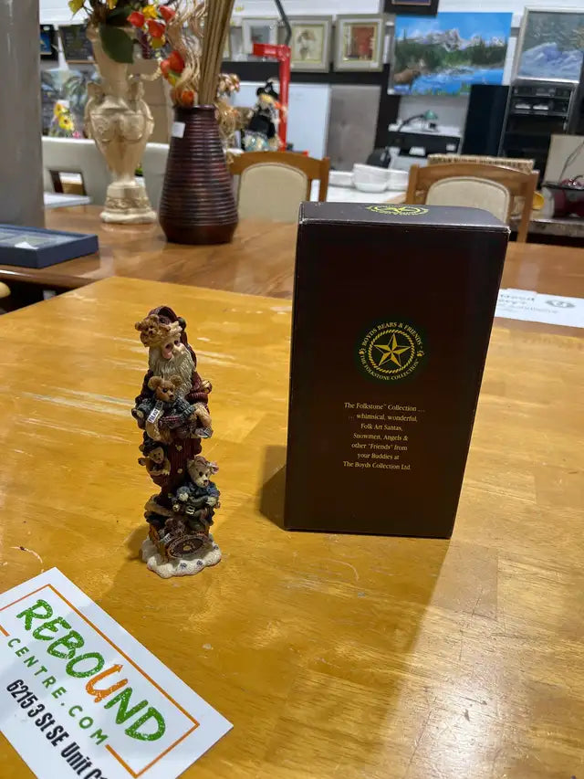 This used Boyds Bear Folkstone Collection figurine, standing at approximately 6 inches tall, depicts a whimsical stack of Santa figures. It's a delightful addition to any holiday display. This item is in good condition. * From the Folkstone Collection * Features multiple Santa figures * Height: Approximately 6 inches The price is $30+5%GST 6215 3rd St SE, Unit C11 - Rebound Centre Daily 10AM - 5PM