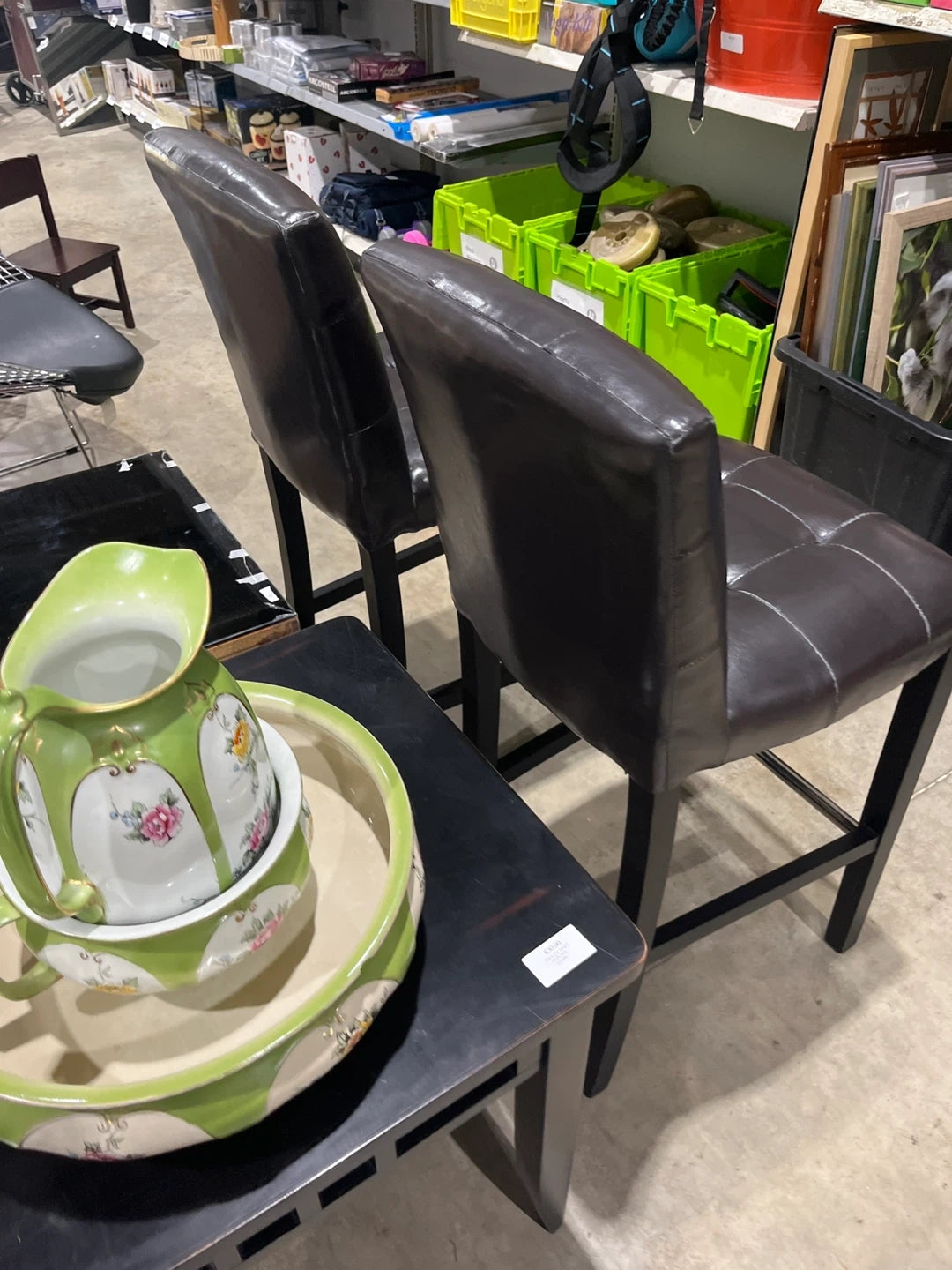 Selling a set of two bar stools with a dark brown faux leather finish. They have a tufted design on the back and seat. There are some signs of wear, but they're still in good condition and perfect for a kitchen island or bar area! 42x18x19” Price is for 2 of them