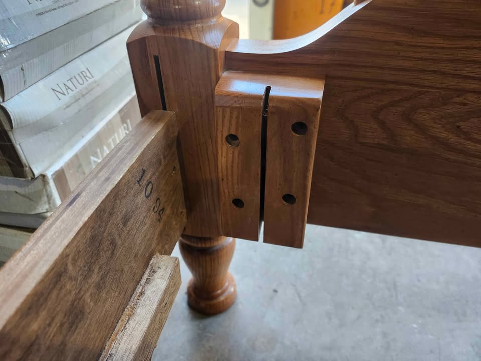 In good as new condition. Made of solid wood. Doesn't require any tools and is very easy to assemble. Has two slots so can be assembled either as a full/double or as a queen.