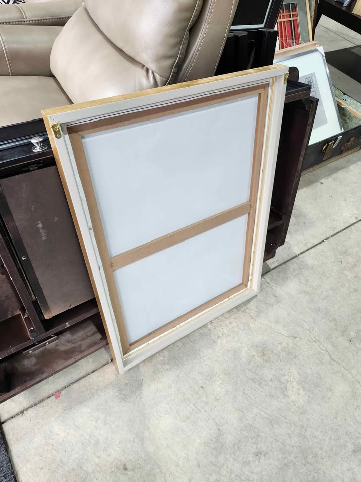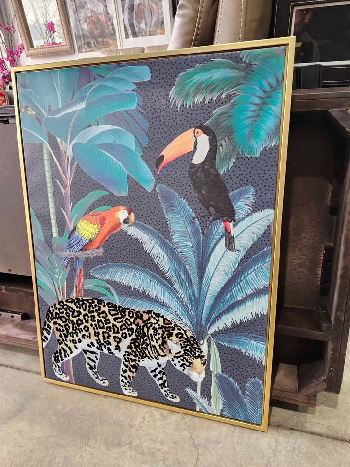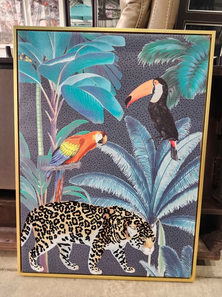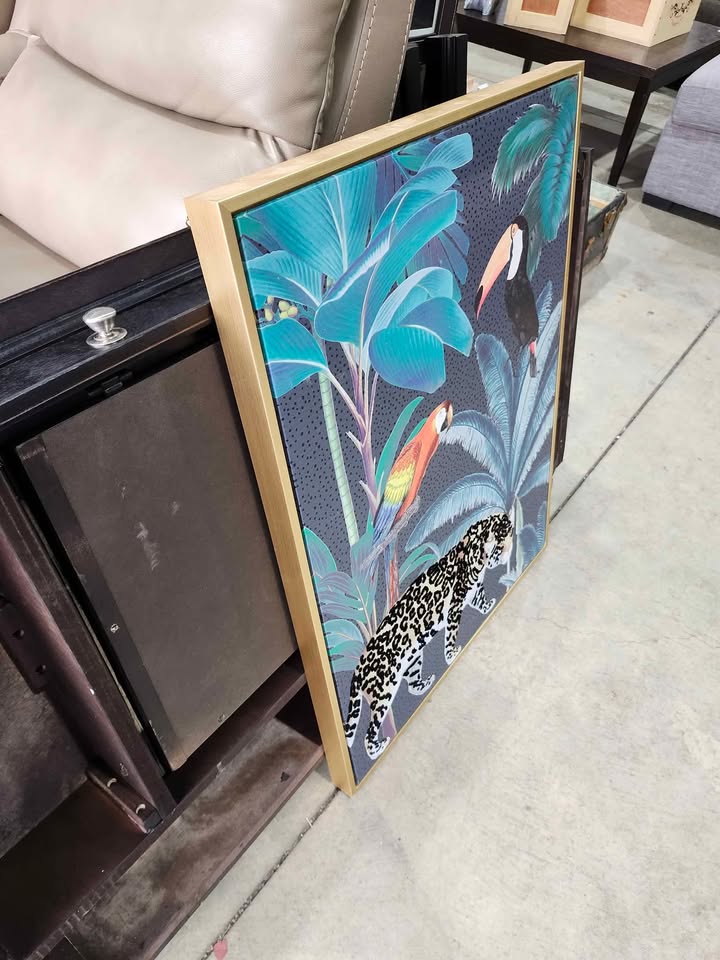Very cool and unique piece! 3D affect with velvet and fabric entwined into the picture. Also has a really nice wooden/golden frame and measures at 24" by 32"