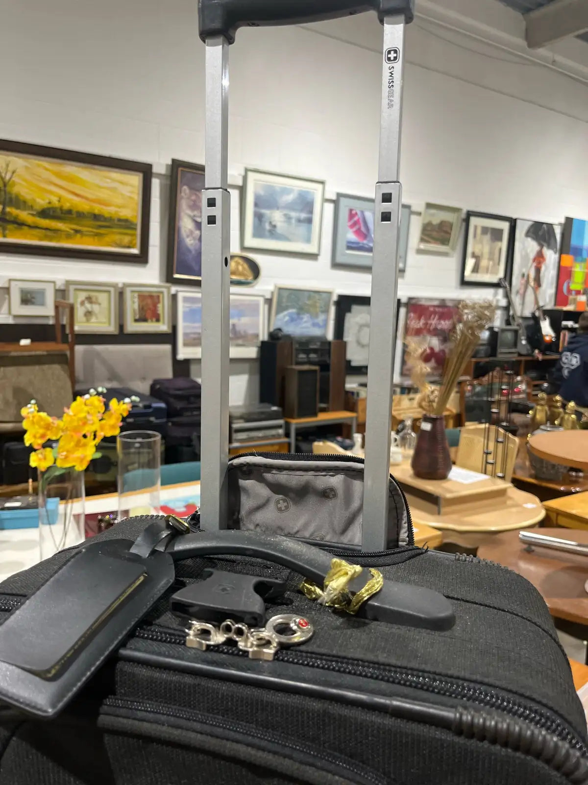 Embark on your next adventure with this Swiss Gear black rolling suitcase, designed for convenience and durability. This used carry-on luggage features a telescoping handle and smooth-rolling wheels, making it easy to navigate through airports and hotels. Its compact size is perfect for short trips, while the multiple compartments offer ample space for organized packing. While it shows signs of use, it remains in good working condition and ready for travel! Specifications: * Brand: Swiss Gear * Type: Rolling Carry-On Suitcase * Colour: Black * Handle: Telescoping * Wheels: Yes * Condition: Used The price is $60+5%GST 6215 3rd St SE, Unit C11 - Rebound Centre Daily 10AM - 5PM