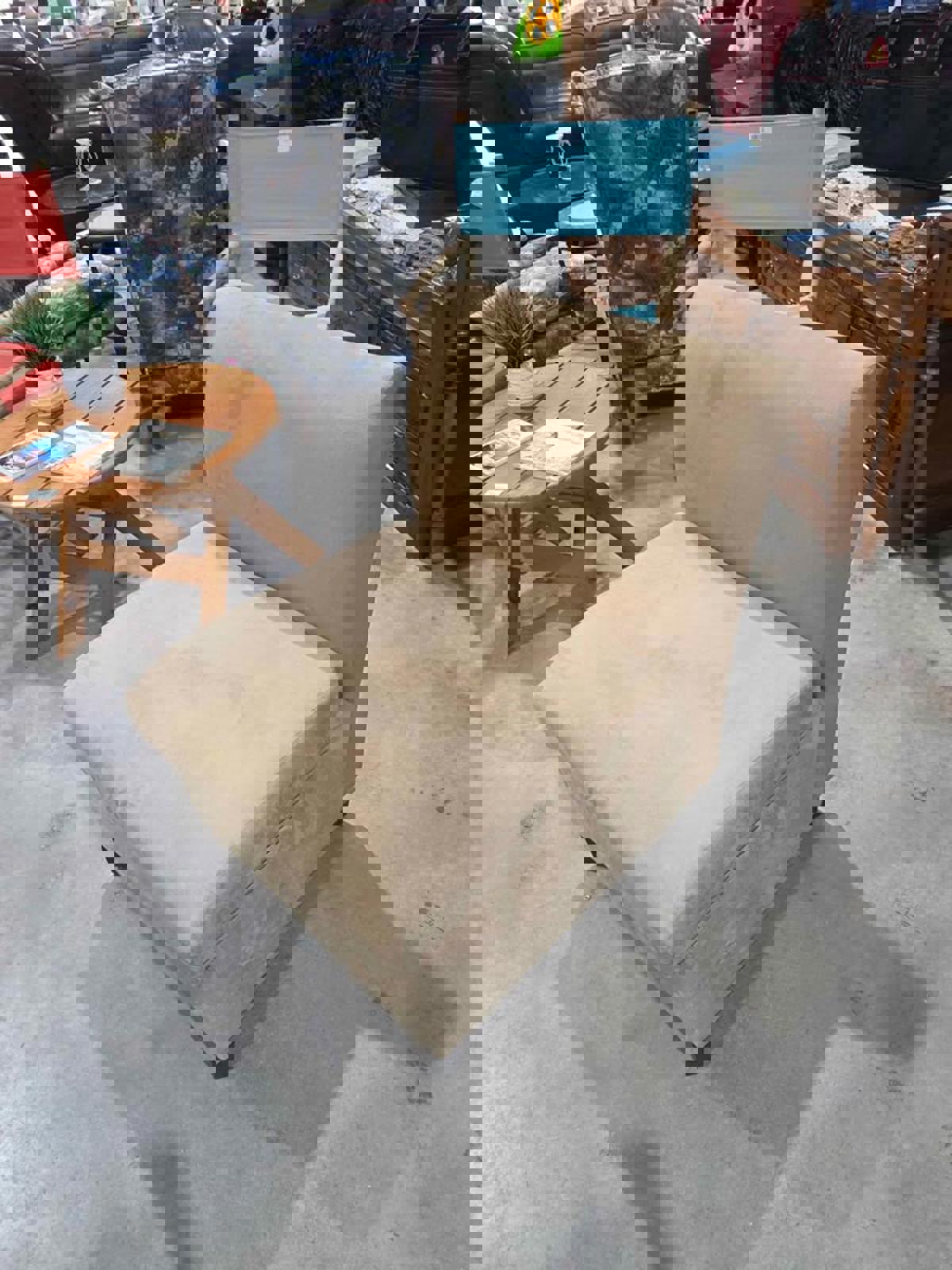 Neutral tan armless chair. Soft fabric, comfy seat for extra seating or a cozy corner. Has built in storage.
