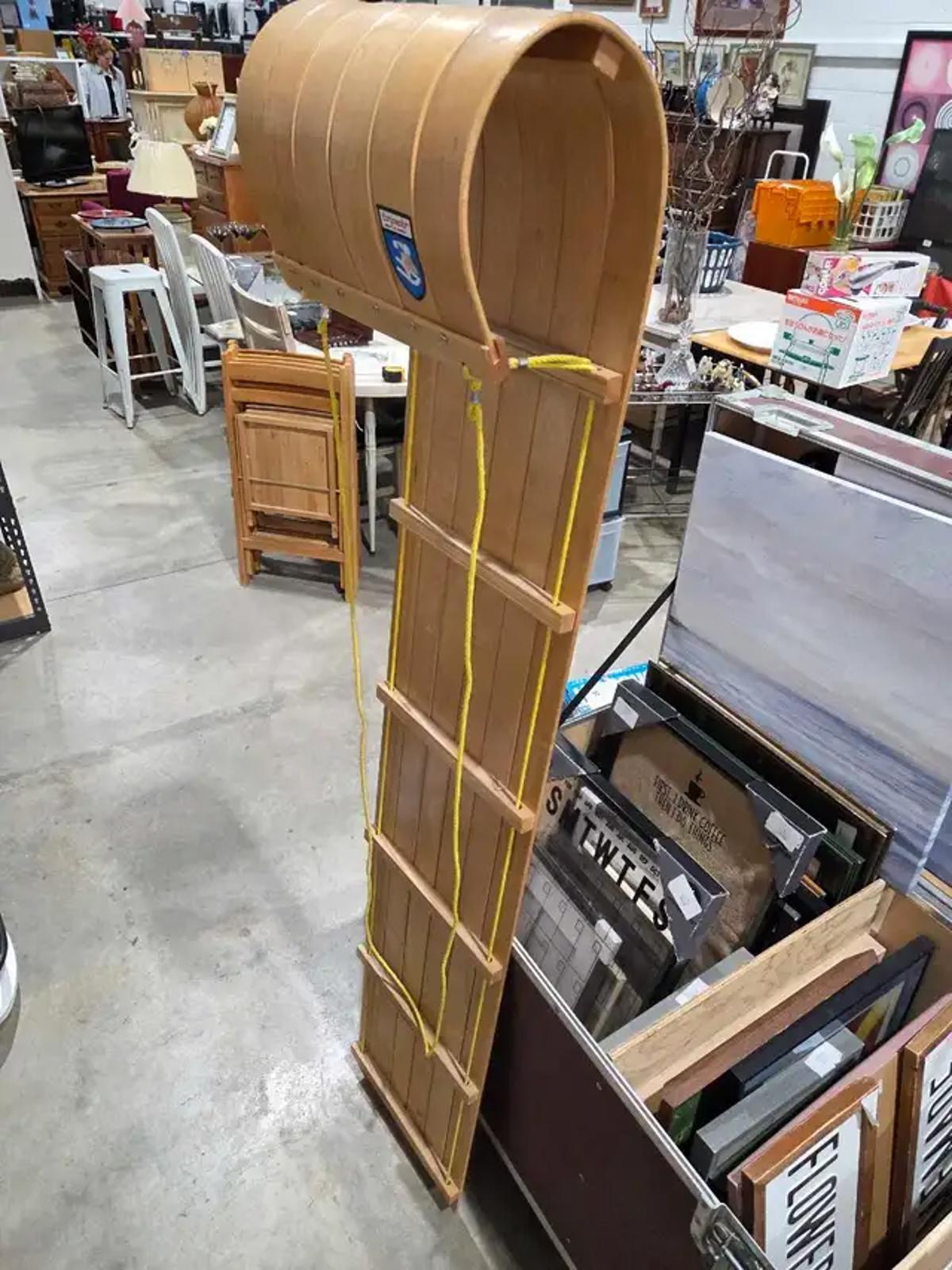 This is a Torpedo toboggan sled with a unique design, perfect for winter fun. It's in used condition, showing some signs of wear, but it's still ready to provide hours of entertainment on the snow. This sled is a classic piece of Canadian winter sports equipment.
