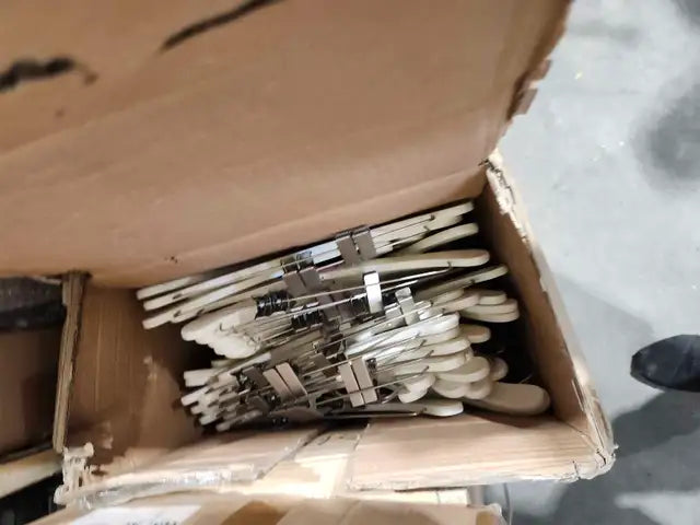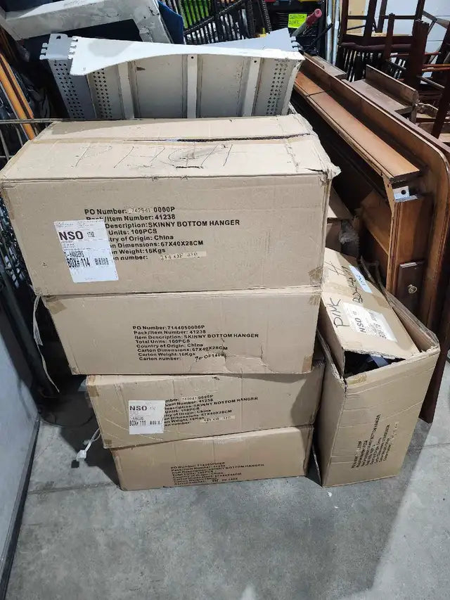 I have a bulk quantity of skinny bottom hangers available, perfect for retail use or organizing your closet. These hangers are designed to securely hold skirts, pants, and other garments. They feature a slim profile to maximize closet space, and the sturdy construction ensures they can handle various fabric weights. These hangers are new and come in boxes of 100 units each.