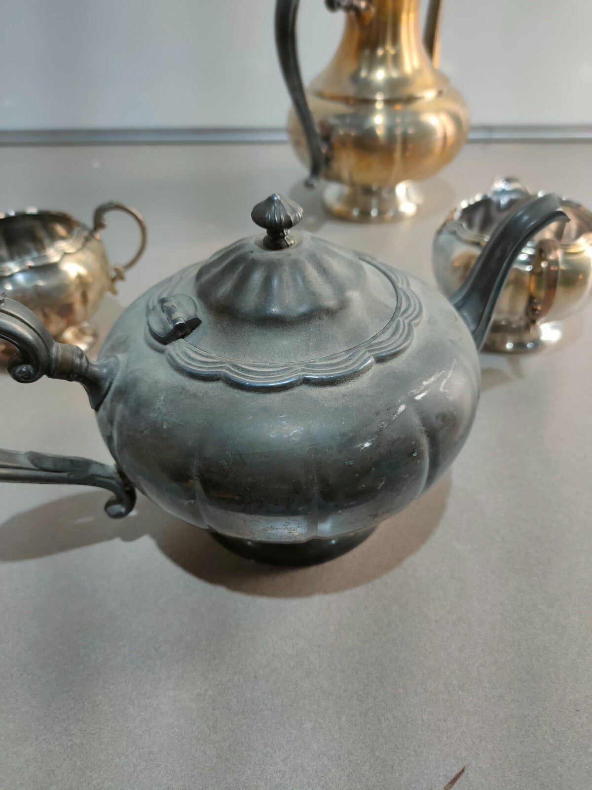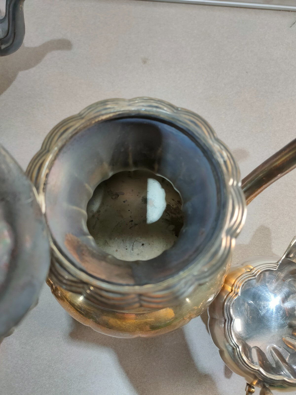 This vintage four-piece tea service from Primrose Plate is a stunning addition to any collection. The Art Deco style and copper accents make it a unique and elegant choice for serving tea or coffee. The set includes a teapot, creamer, sugar bowl, and six cups and saucers, all made of silverplate with a beautiful copper finish. The brand is known for its quality and attention to detail, making this set a true gem for any tea lover. Whether you're looking to add to your collection or simply want to enjoy a cup of tea in style, this vintage set is sure to impress.