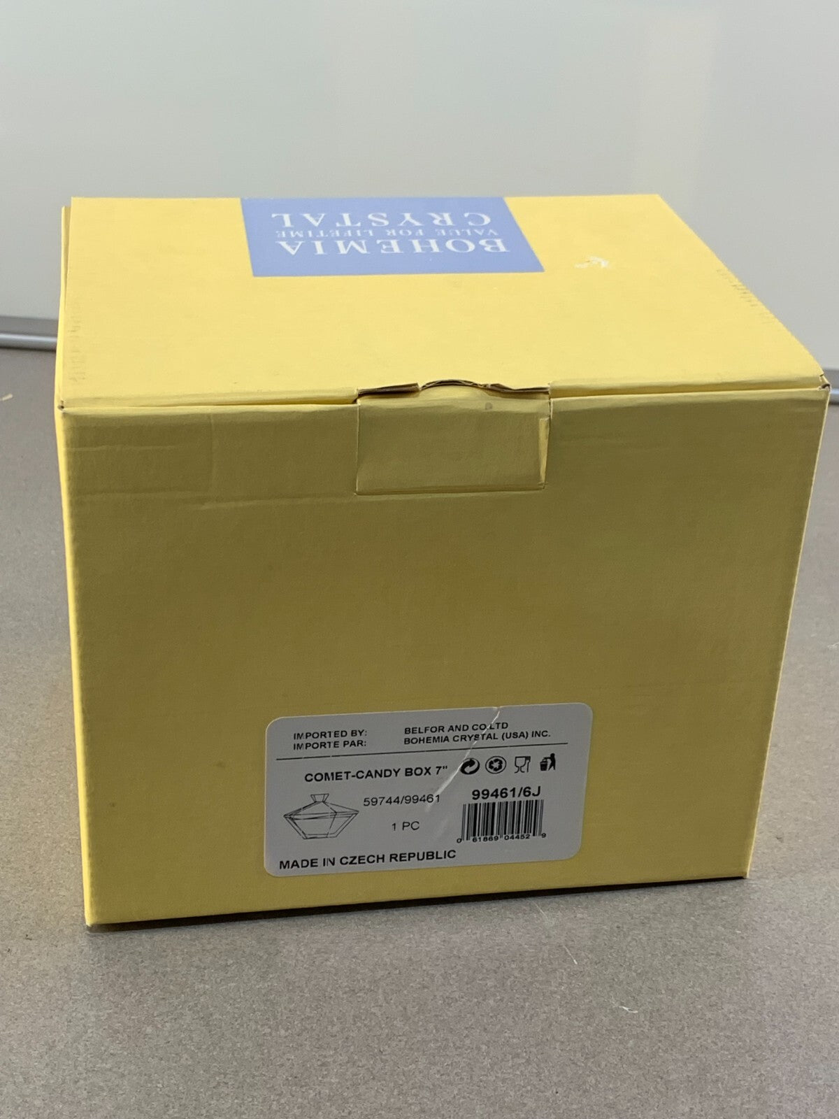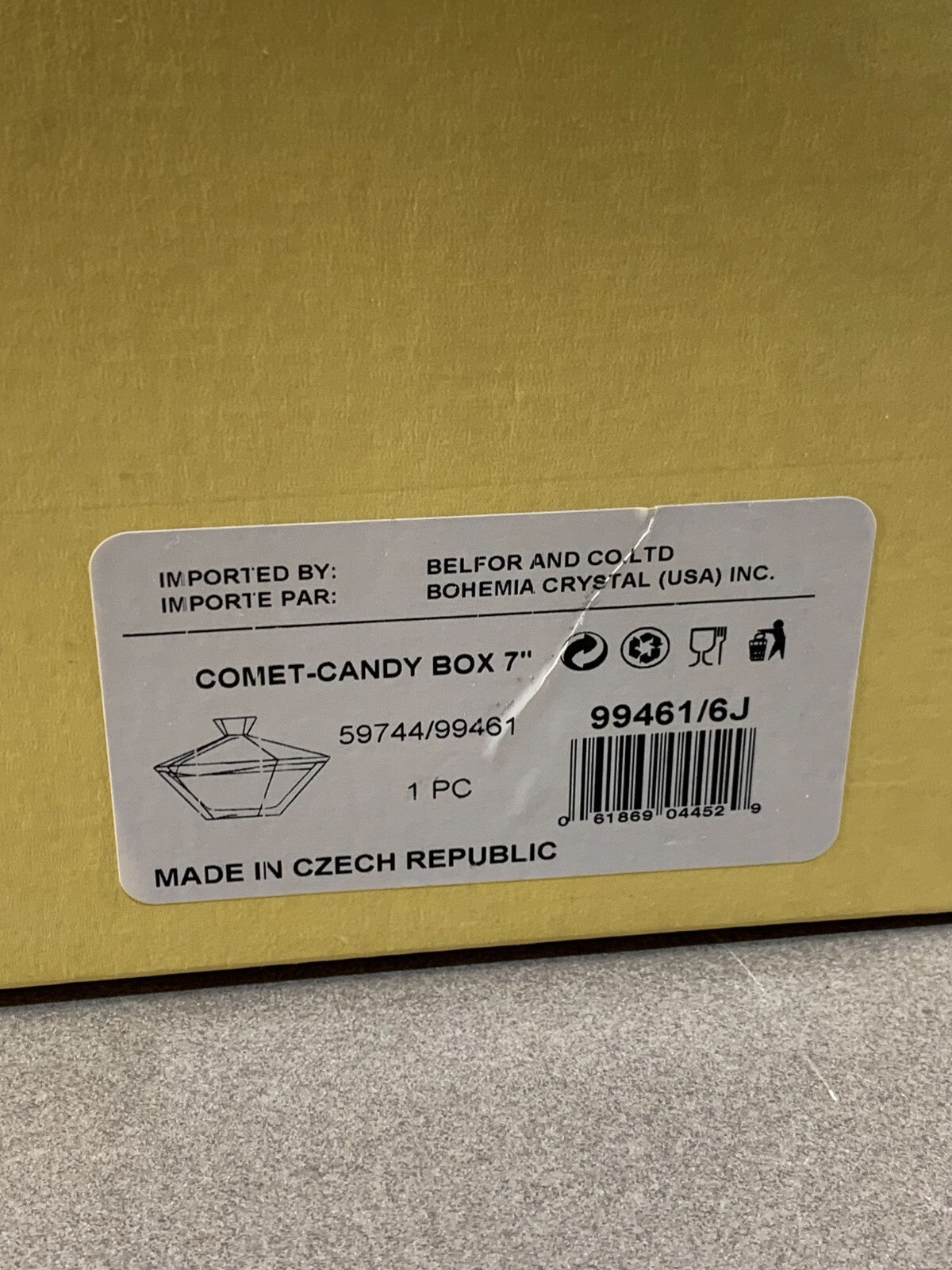 The Bohemian Czech Clear 24% Lead COMET-CANDY BOX is a luxurious and decorative collectible made of crystal. With its unique brand name and specific material composition, this 7" candy box exudes elegance and charm. Perfect for storing candies or other small trinkets, this piece adds a touch of sophistication to any collection or display.