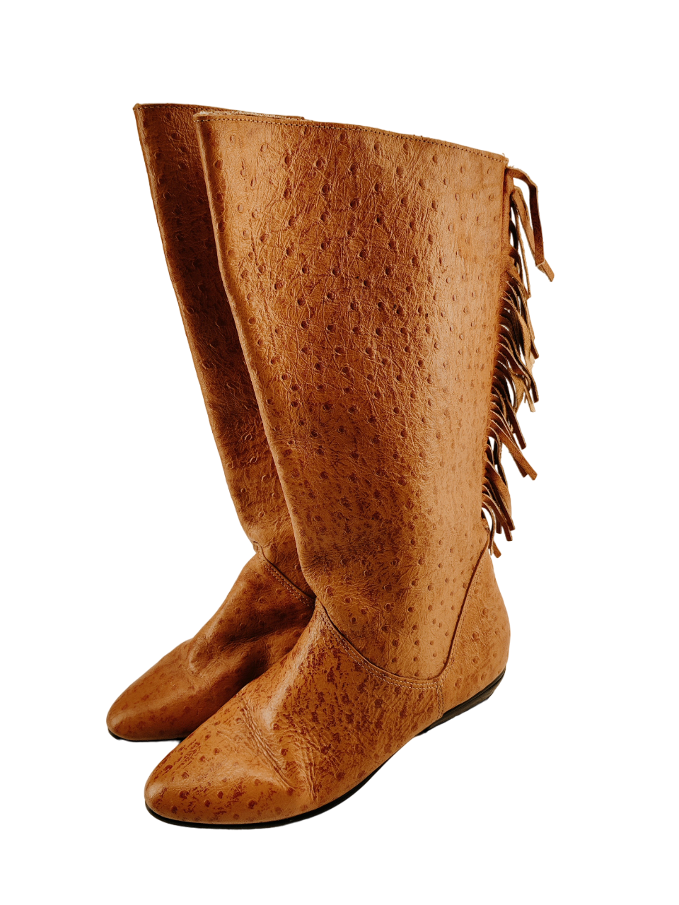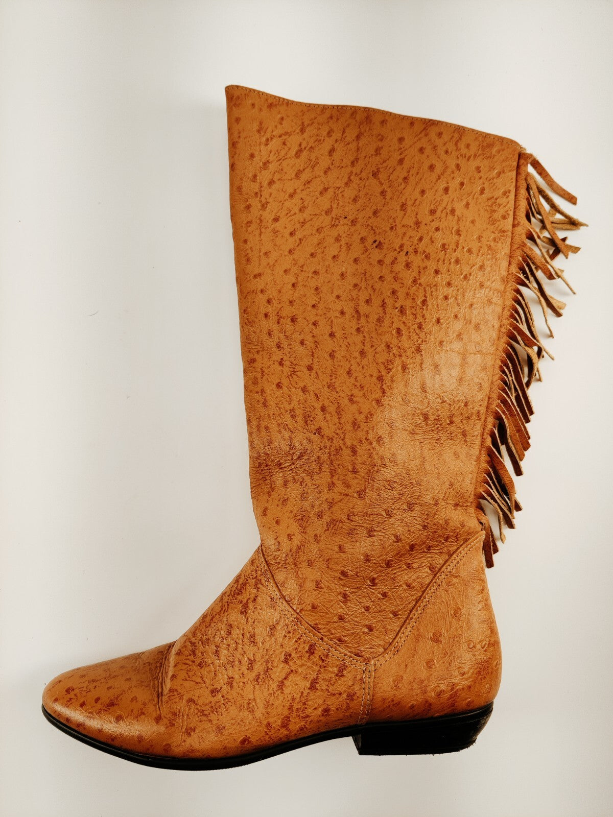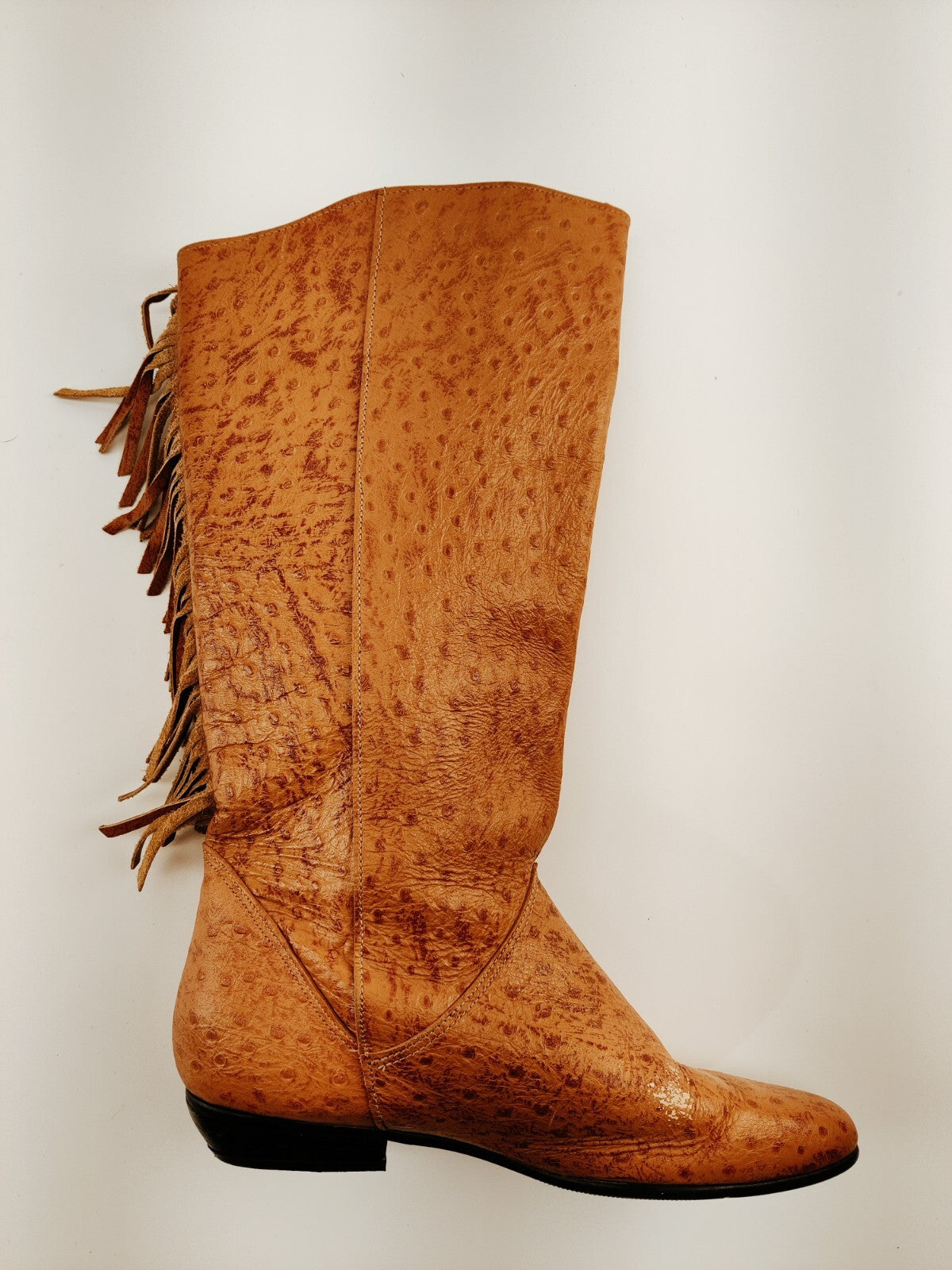 Vintage Cougar Tan Ostrich Leather Fringe Boots Women's Size 7.5