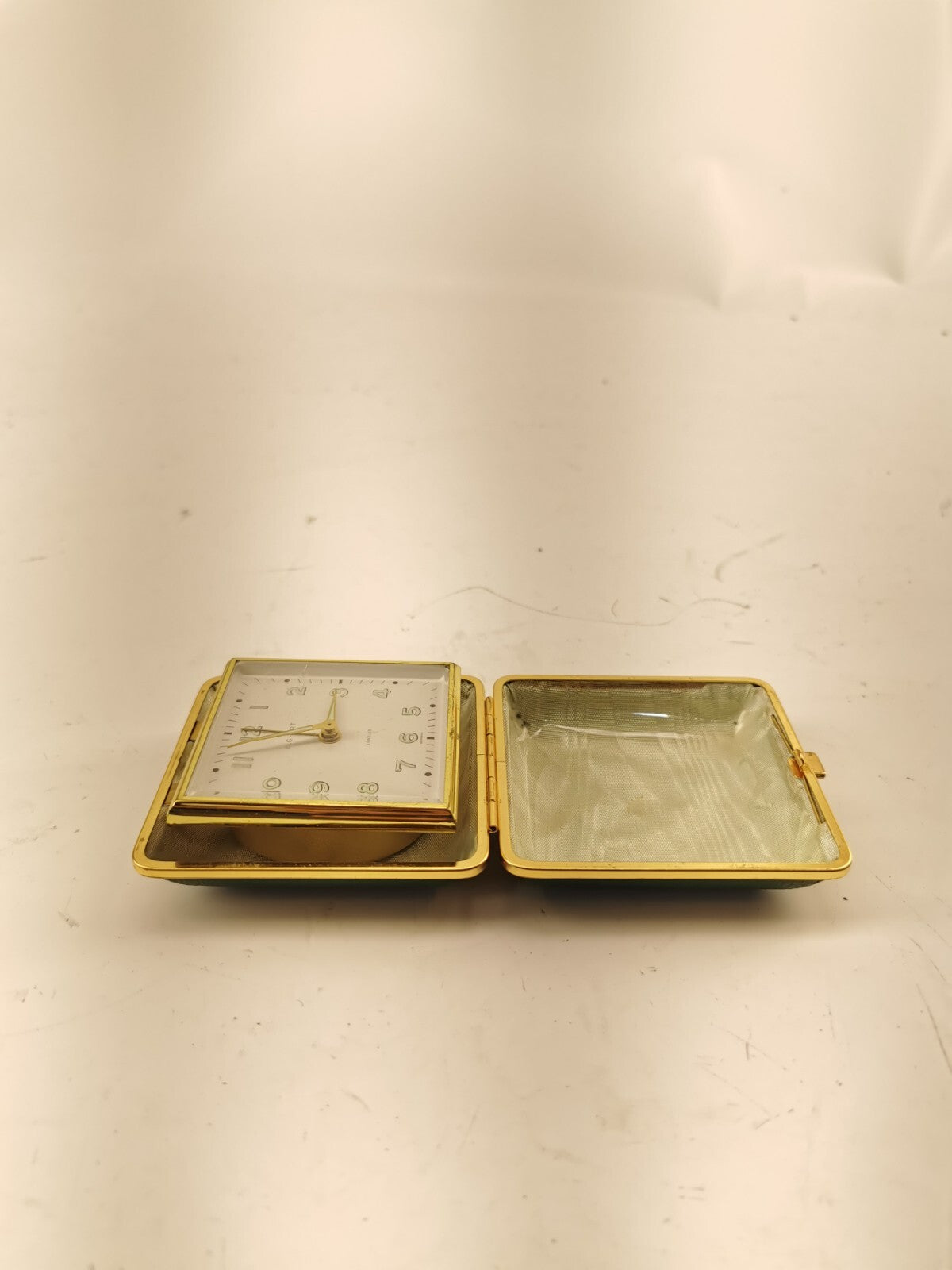 This vintage ELG-ART travel clock is a stunning piece that will add a touch of elegance to any collection. With a mechanical movement and analog display type, this clock is a true gem for collectors of vintage items. The clock features a wind-up feature and is an original piece, making it a must-have for any serious collector. The clock is also folding, making it easy to store and transport. Perfect for alarm clock enthusiasts and collectors alike, this clock is sure to be a conversation starter.