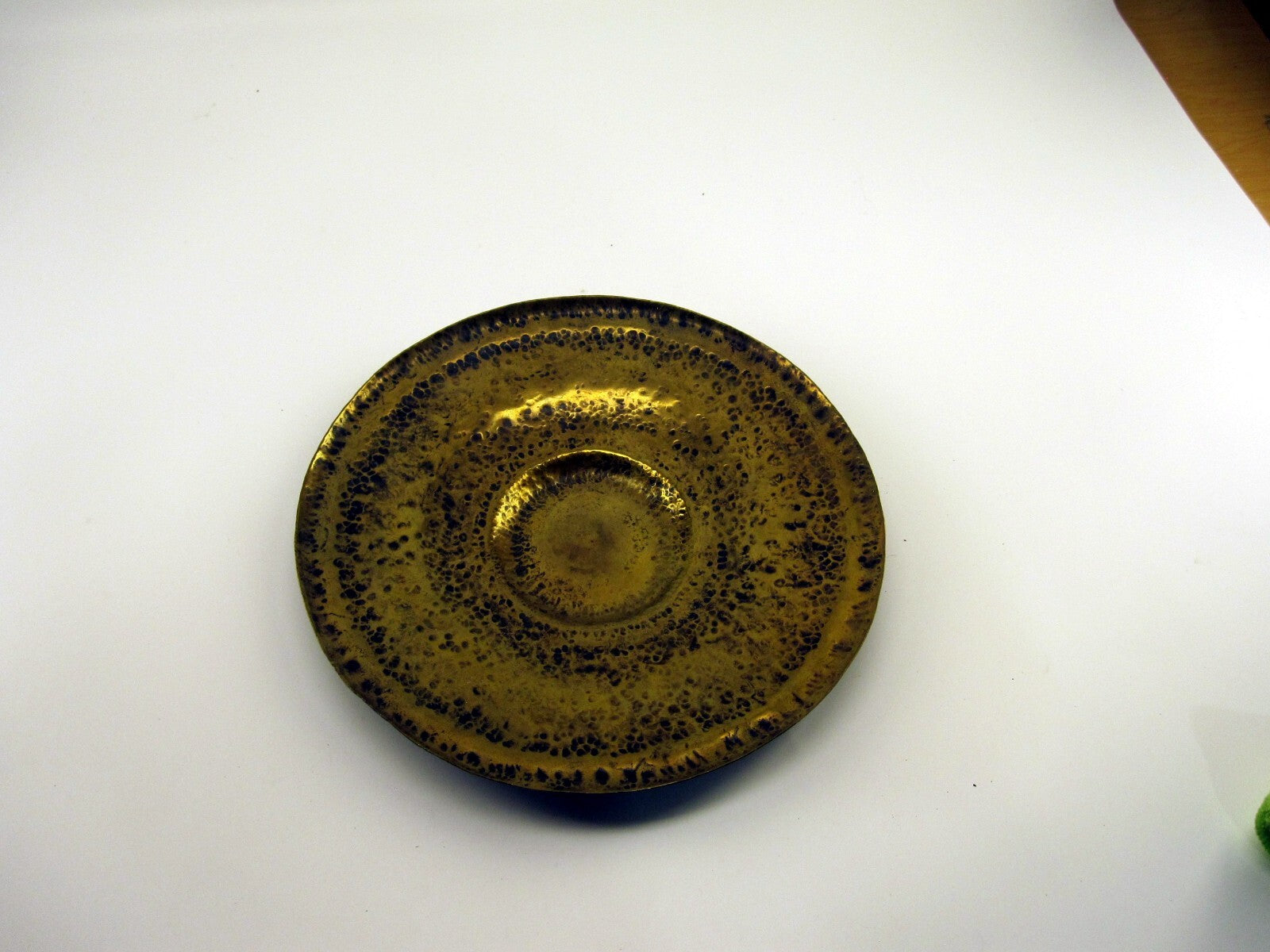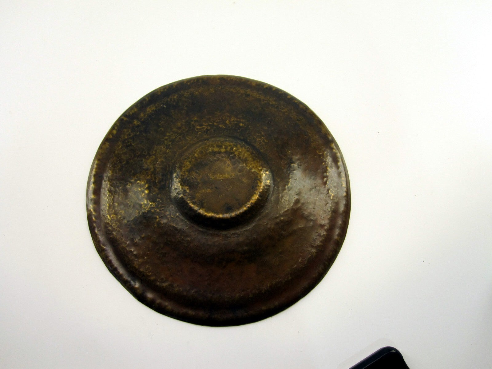 This vintage plate is a true masterpiece of handiwork. Crafted from high-quality brass, it features a unique hammered texture that adds a touch of elegance to any room. Perfect for collectors of metalware and brass items, this plate is sure to impress with its intricate design. The plate's object type is a classic plate, and it is made from brass - a durable and long-lasting material. Its exquisite design is perfect for adding an antique flair to any collection, making it a must-have for all collectors of collectibles. Display it in your home or office to showcase its beauty and add a touch of history to your decor.