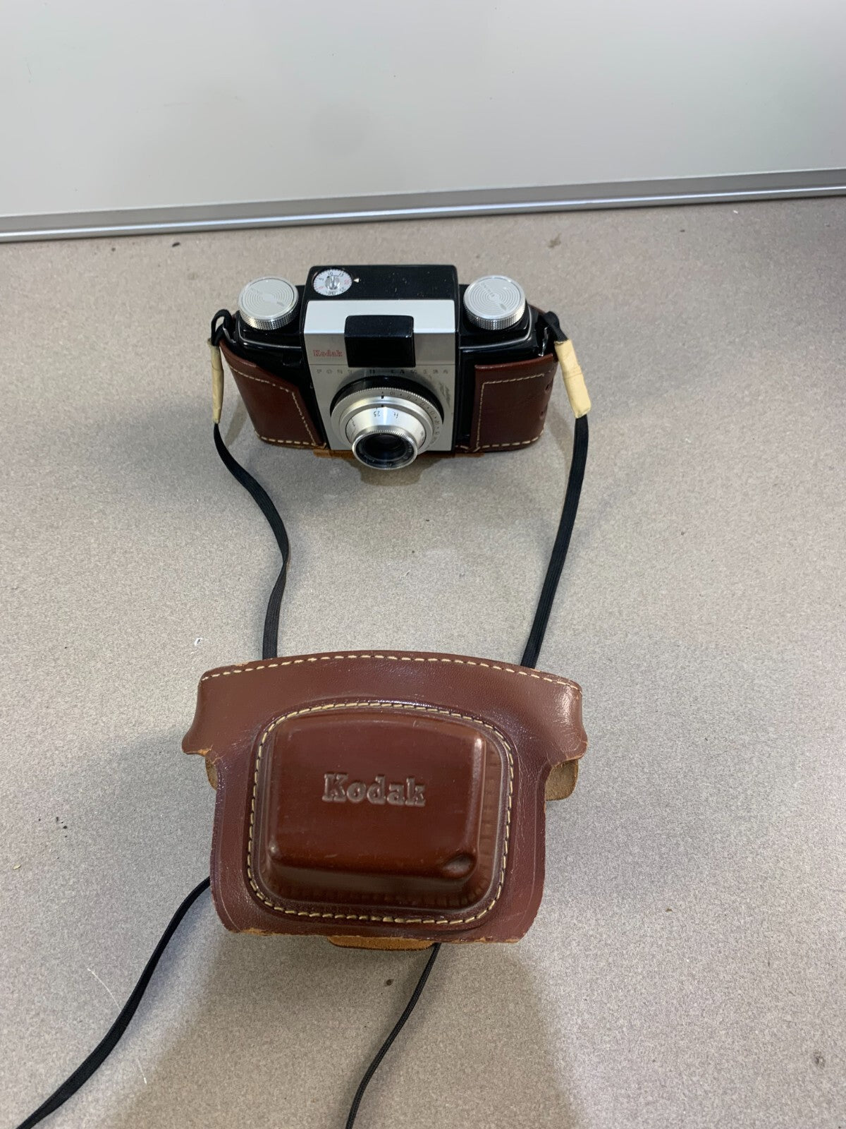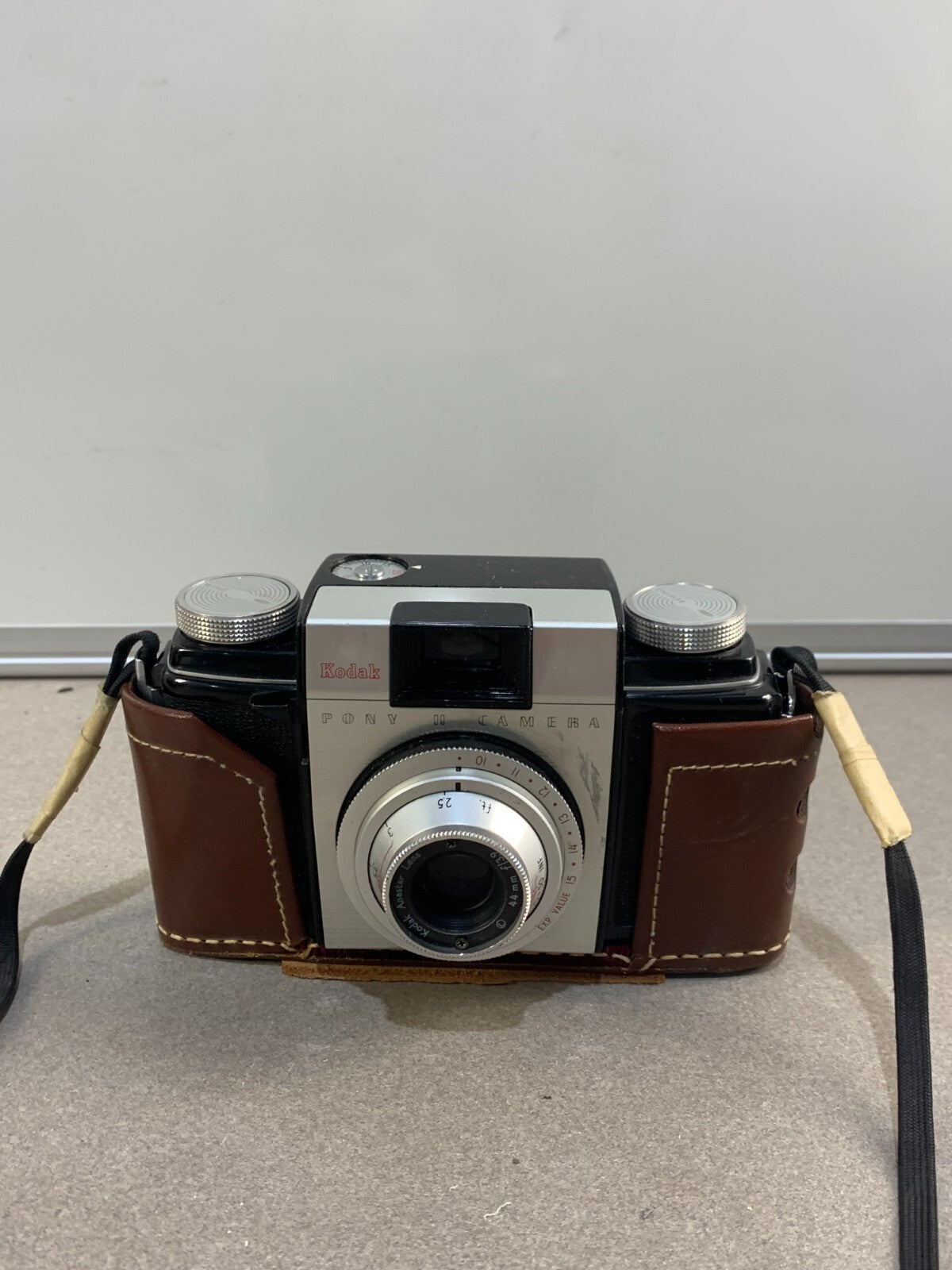 The Vintage Late 1940s Early 1950s Kodak Pony II Camera with Case is a classic piece of photographic equipment from the mid-20th century. Known for its reliability and user-friendly design, the Kodak Pony II was a popular choice among photographers during this time period. This camera, paired with its original case, offers a nostalgic look into the history of photography and serves as a great collector's item for vintage camera enthusiasts. Perfect for those interested in exploring the charm and simplicity of film photography, this Kodak Pony II is sure to be a unique addition to any collection.