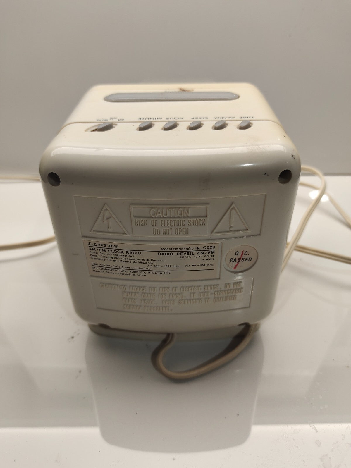 Bring a touch of retro charm and practical functionality to your home with this vintage Lloyd's FM/AM Radio Alarm Clock. Perfect for adding a nostalgic vibe to your decor or as a functional piece for your bedside table.