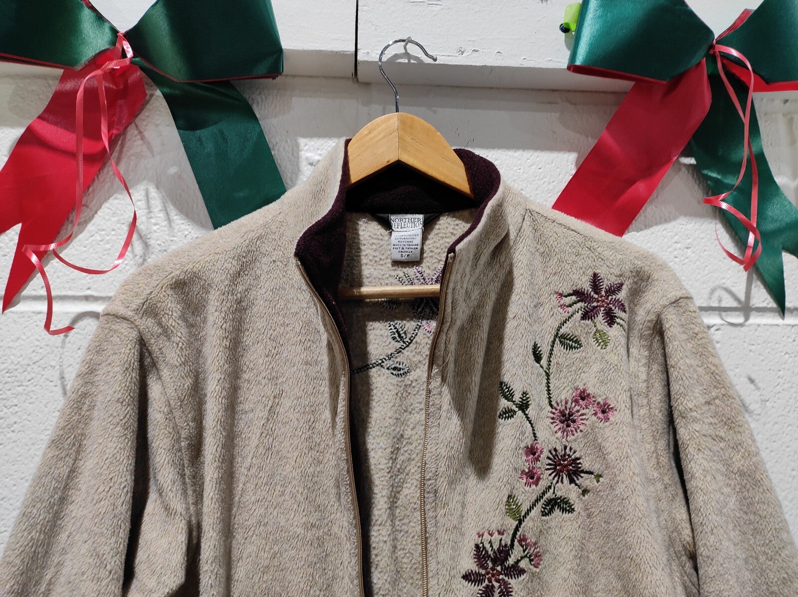 This Vintage Northern Reflections Cotton Embroidered Cardigan Sweater is a timeless piece that adds a vintage flair to your wardrobe, offering both style and comfort despite the zipper issue.