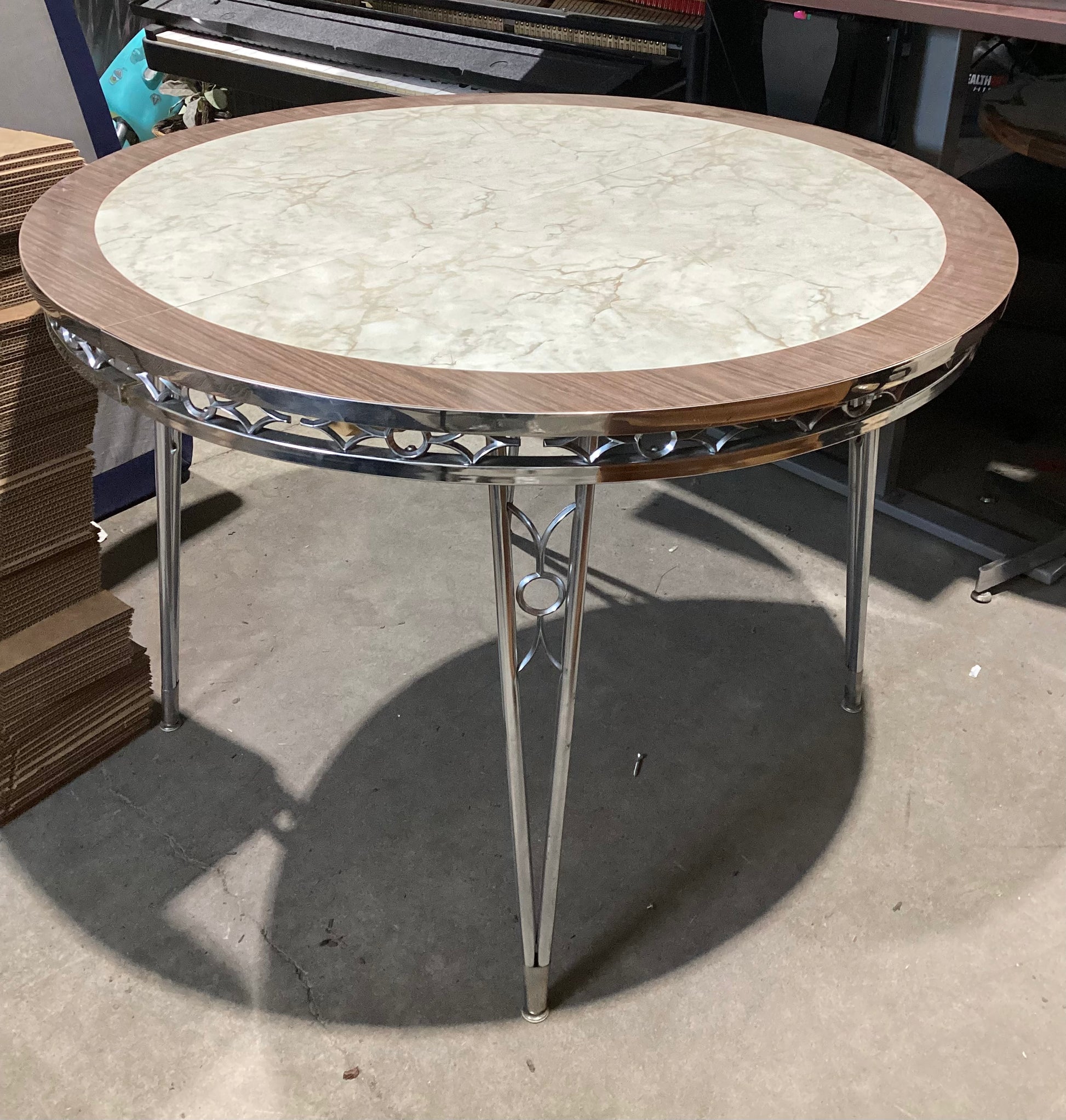 A beautiful round table. Features a chrome frame and legs. A marbled effect top. The table is perfect for a casual meal.