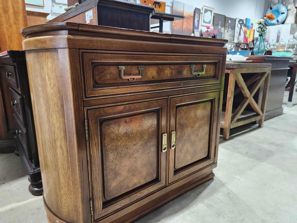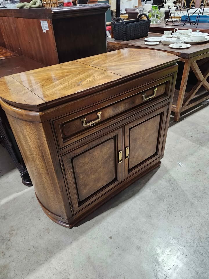 Beautiful curved wood cabinet. Features a open top server, one drawer and two doors. Solid wood construction. Nice addition to any home. Measures: 40W. 18D. 32H Visit our Thrift Store Rebound Centre Located at 6215 3rd St SE - Unit C 11 Open everyday 10am - 5pm local pick up/delivery available (for a fee).