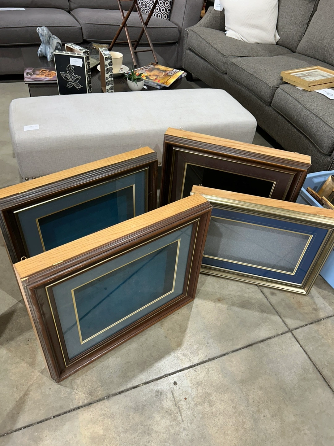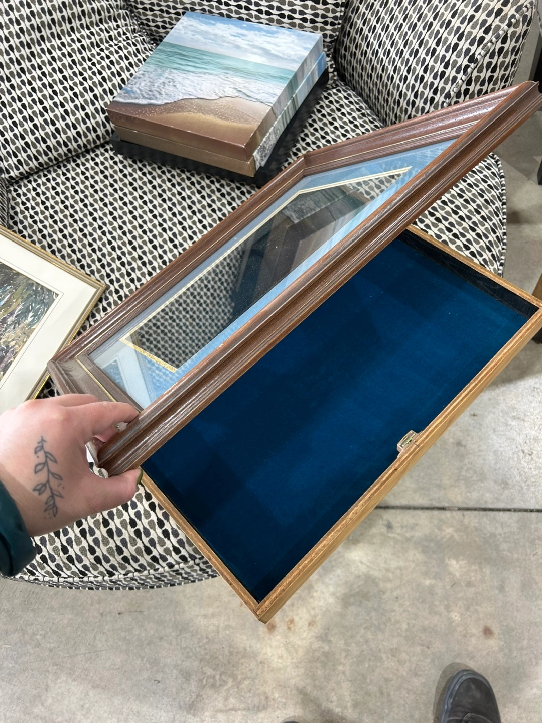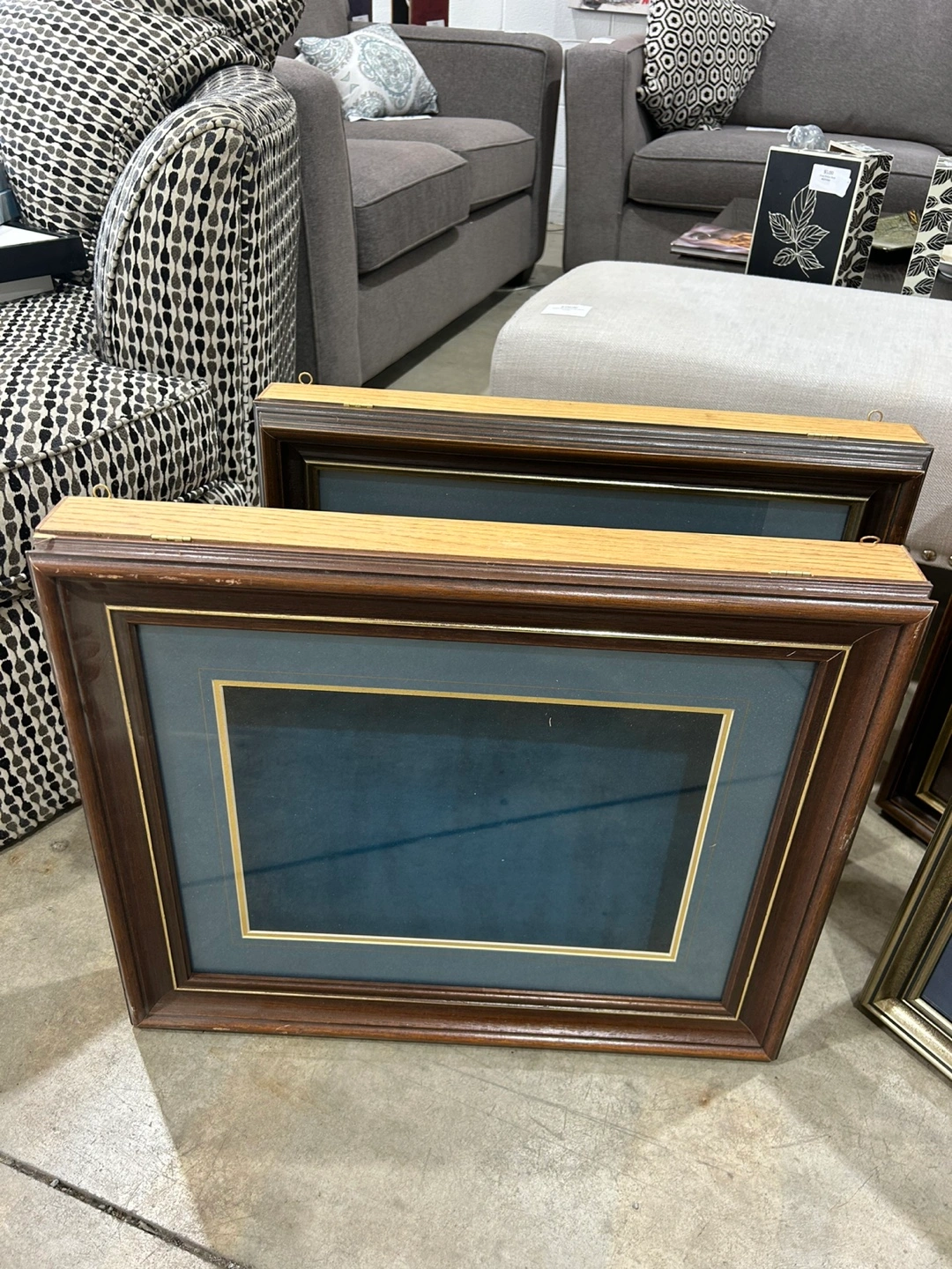 Beautiful vintage shadow box frame. Features a dark wood frame, blue inner matting, and a hidden compartment. Perfect for displaying cherished keepsakes or photographs. Ready to be personalized. 4 available at $30 each.