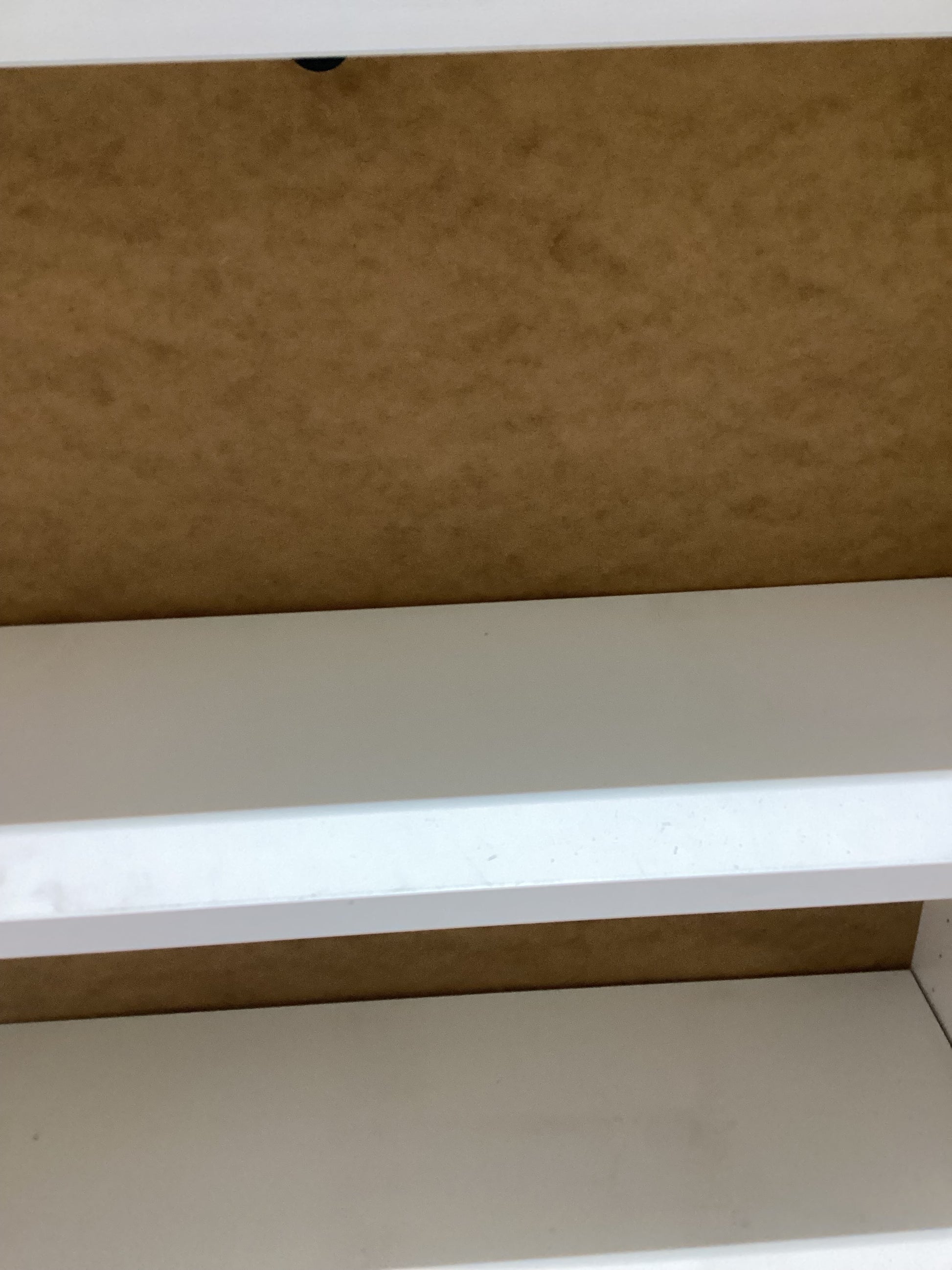 Selling a white bookshelf that's in great shape! It measures approximately 31.5 inches wide, 11 inches deep, and 42 inches tall