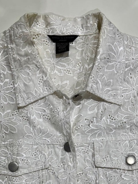 The White Light Jacket by Anne Carson is a plus-size women's jacket made from linen. It features a basic jacket style in a crisp white color, perfect for adding a touch of sophistication to any outfit. The jacket is designed for women who wear size 1X and is ideal for those looking for a stylish and comfortable outerwear option.