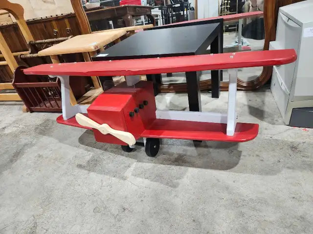 This charming, used wooden airplane shelf is sure to delight any child or collector, featuring a red and white painted finish with rolling wheels and a rotating propeller. It just needs to be mounted onto a wall and its good for take off. Measures at 4ft wide