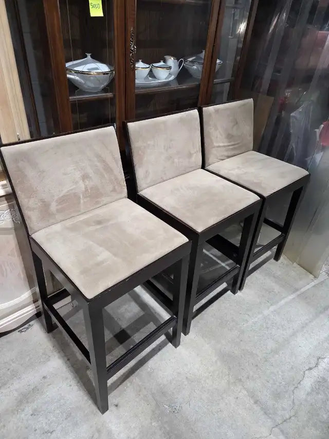 3 available $30 each. These are used bar stools with a sturdy construction and a comfortable upholstered seat, perfect for adding seating to your kitchen island or bar area. Here are some details about the bar stools: * Set of 3 * Upholstered seat * Wooden frame * 27" seat height.