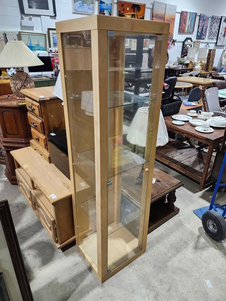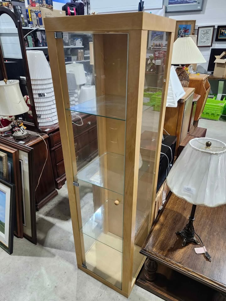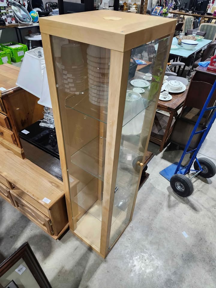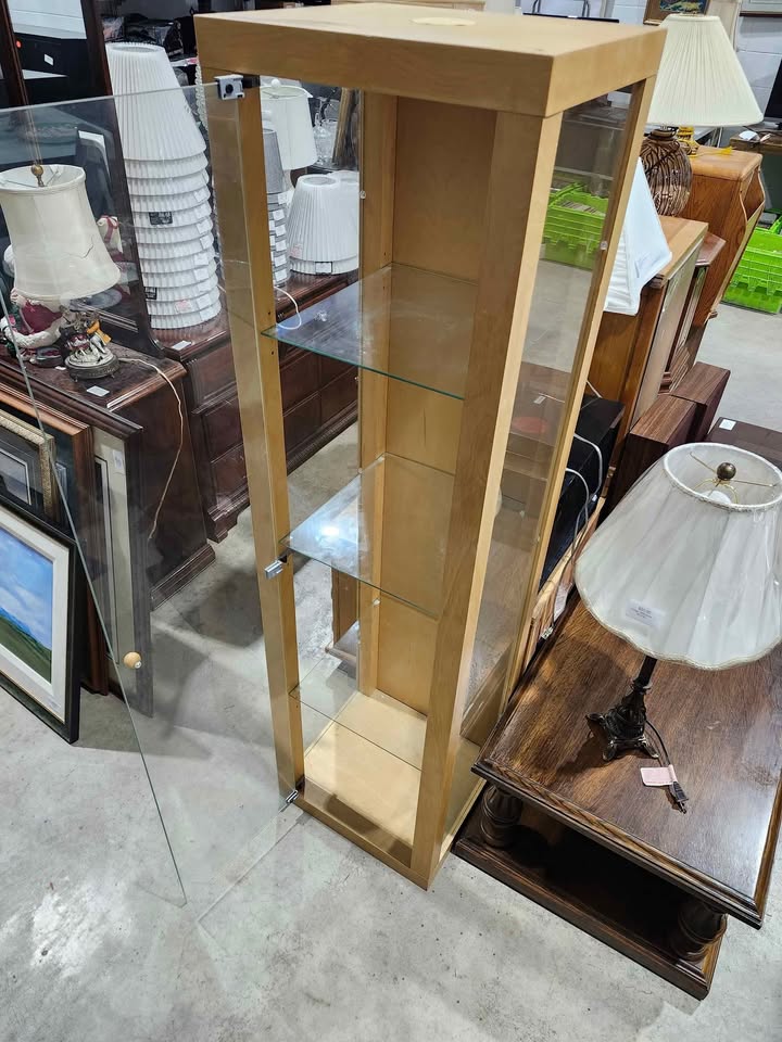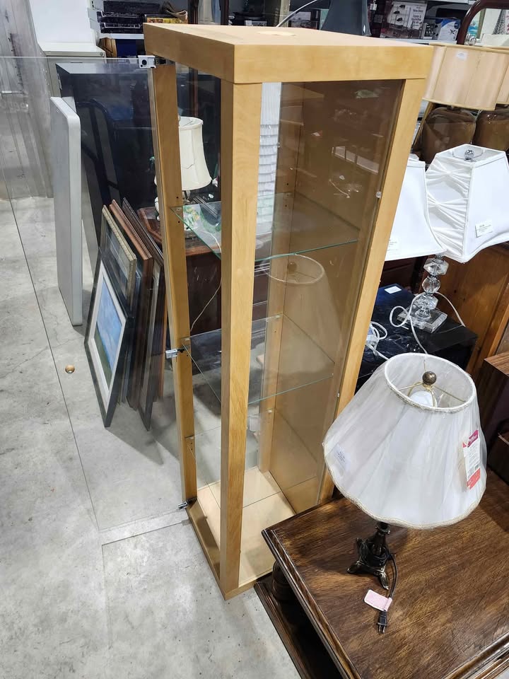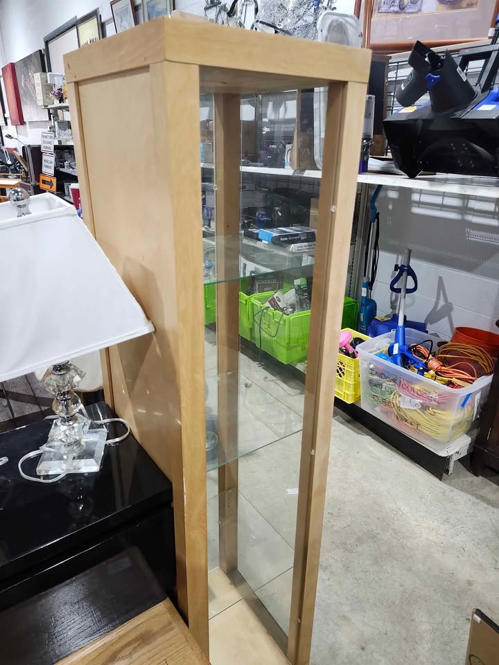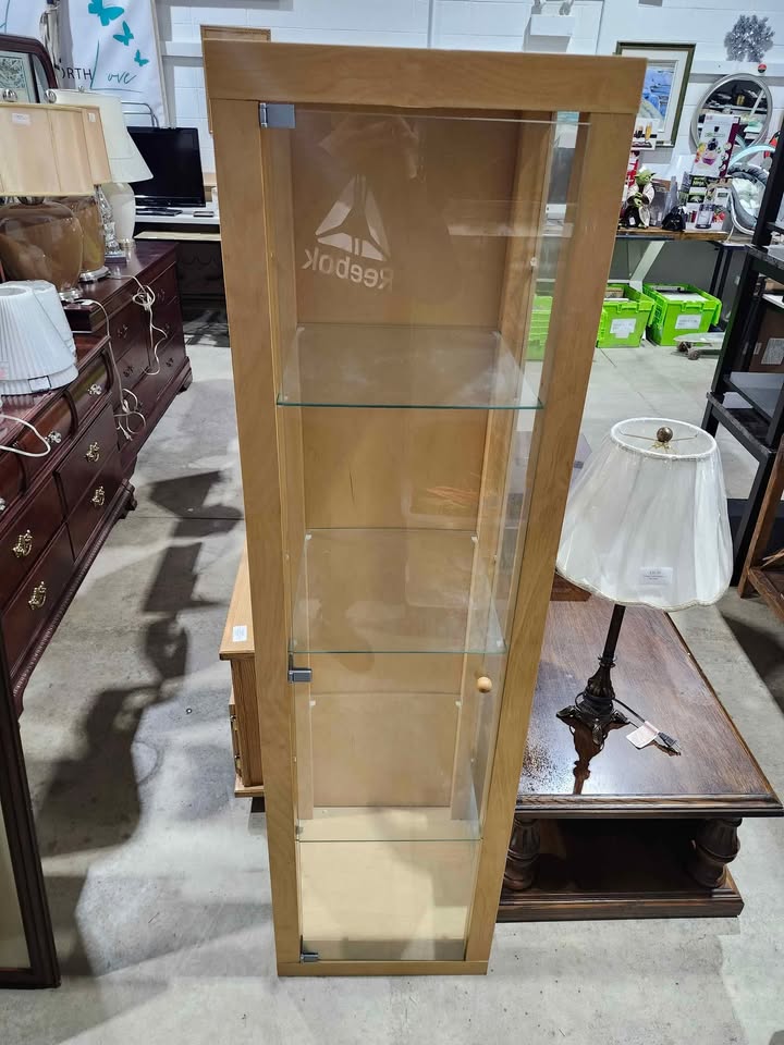 Excellent condition with very minimal wear from use. Has 3 glass shelves and a glass door. It doesn't have a light but looks like it has an insert to install one. Measures at 18" wide, 16" deep and 66.25" tall. . . . . . . . . . We now have a physical store! Rebound Centre, 6215 3 St SE - Unit C11 (Phillips Park, right next to CHINOOK). Open 7 days a week 10-5. All prices are subject to GST. We accept credit/debit on-site or you can purchase from our website at Reboundcentre.com for reserve/pick up. All sales are final.
