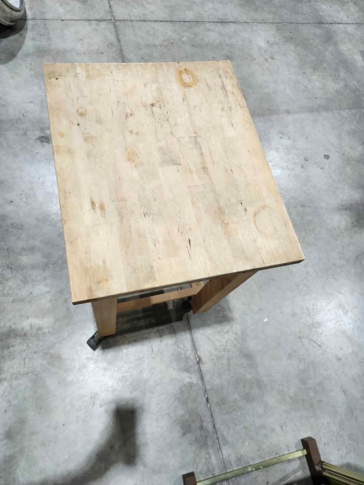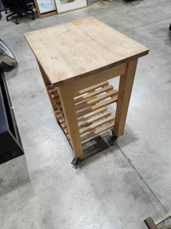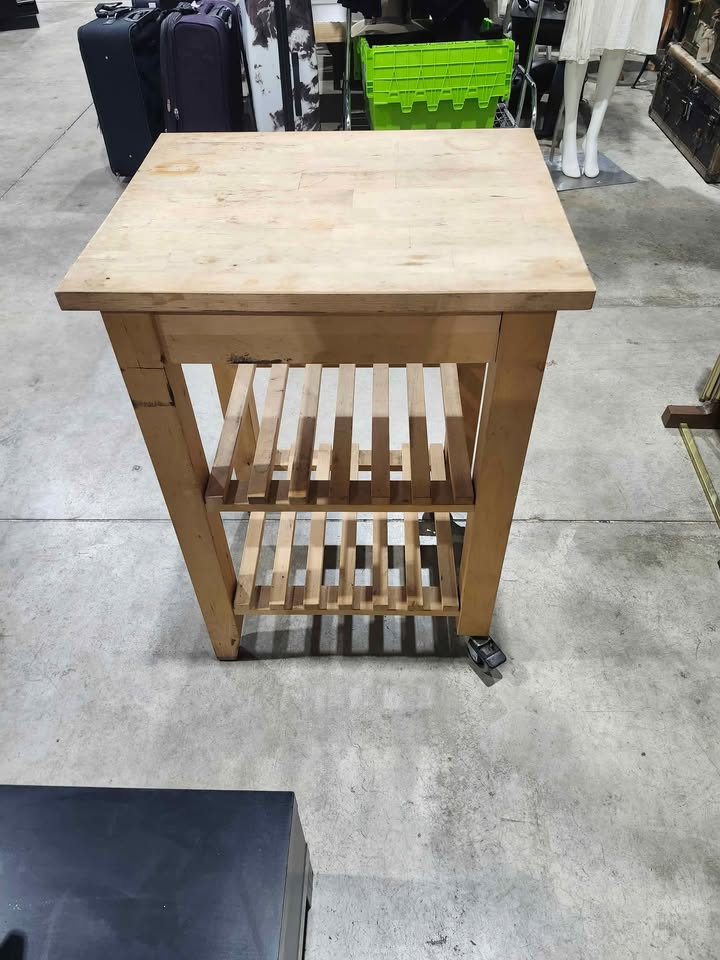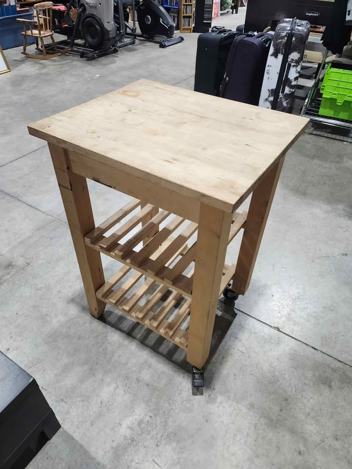 Selling a wooden kitchen island cart. It has a butcher block style top and two shelves with wooden slats. There are some signs of use on the top surface, but it's still in good condition and ready for a new home! Measures at 2ft by 20" and 33.5" tall. 6215 3rd St SE, Unit C11 - Rebound Centre Daily 10 AM – 5 PM Local pickup/Delivery available (for a fee depending on location/item). Feel free to drop us a message or visit us in store.