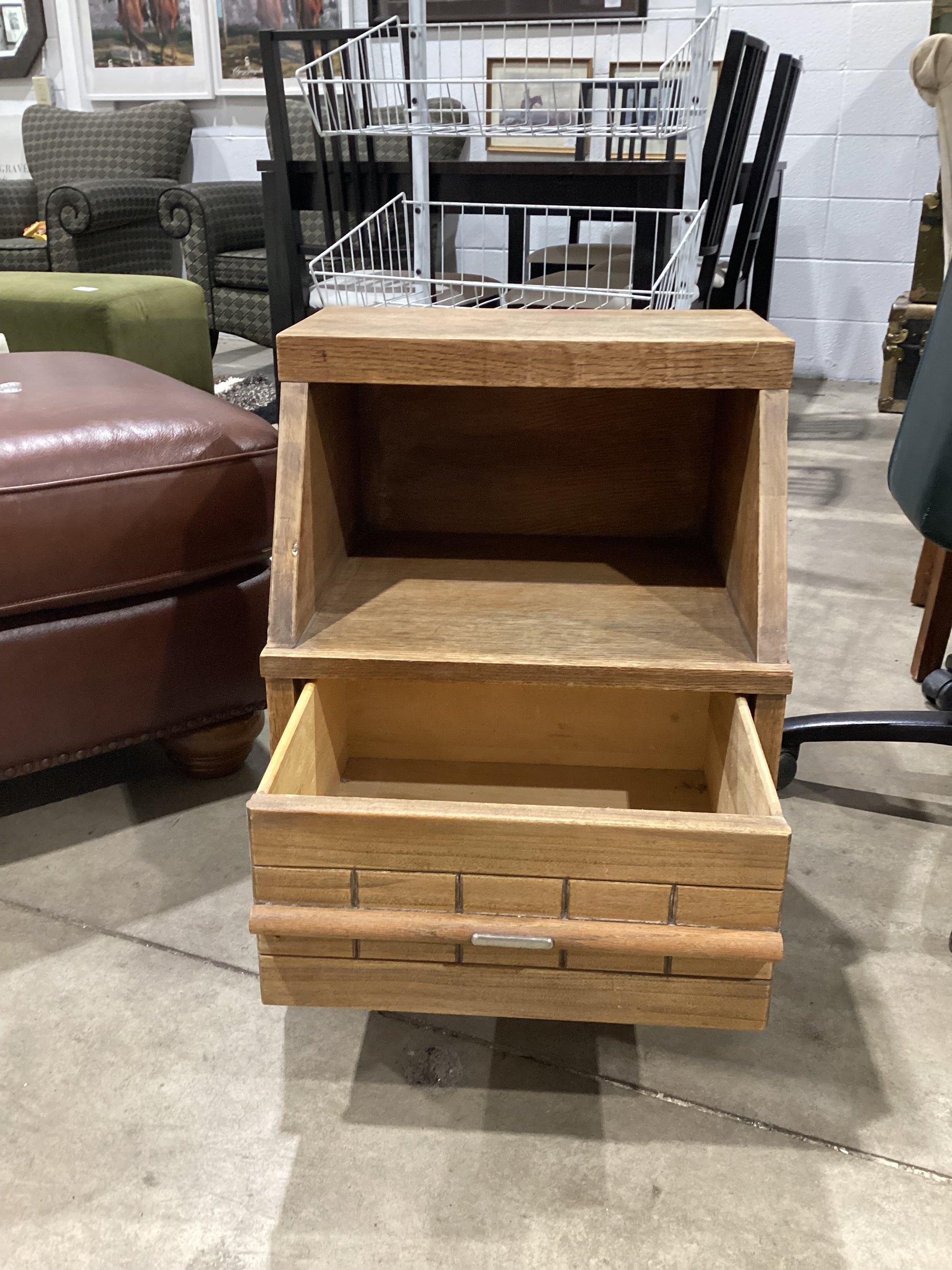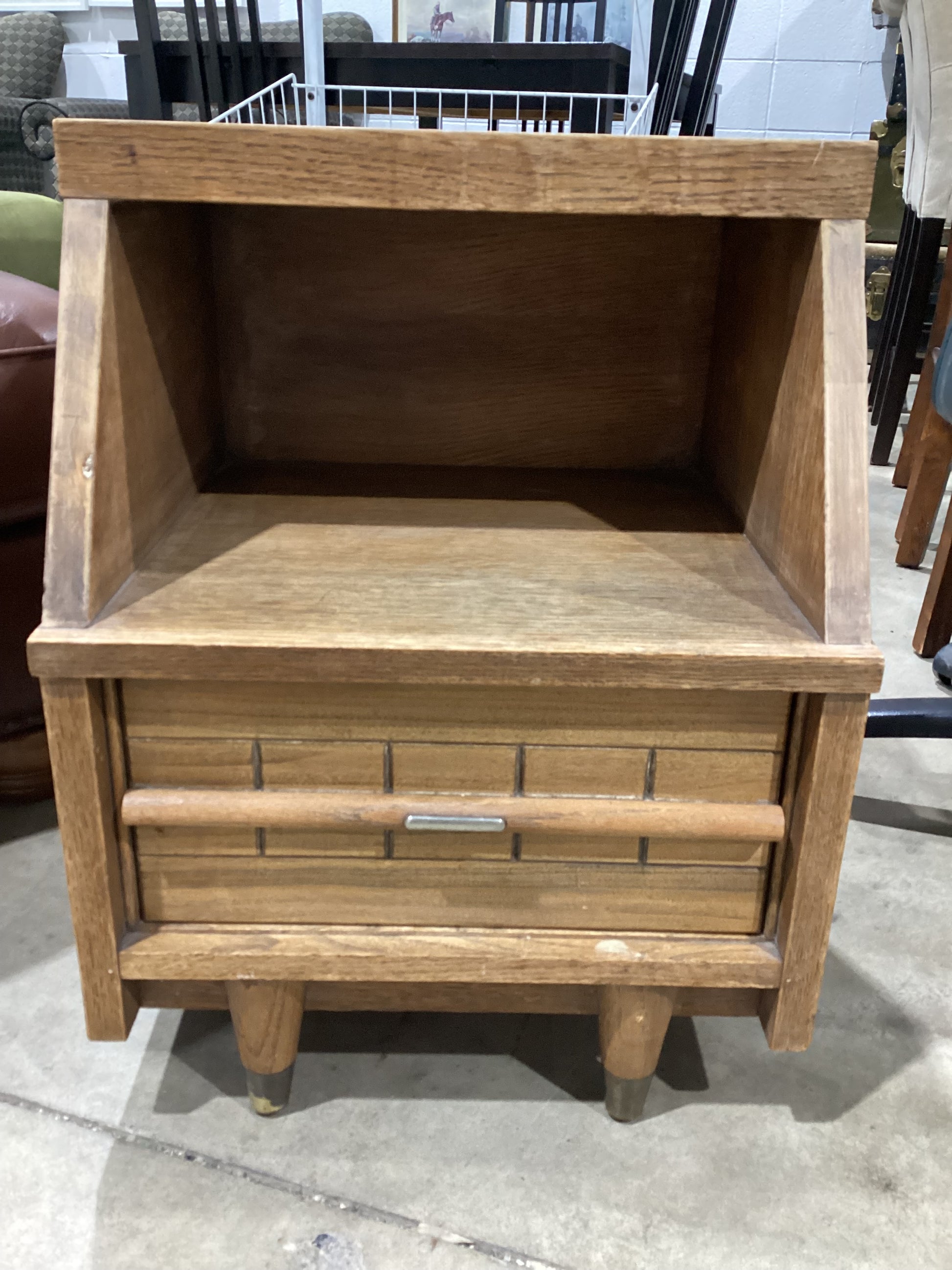 Here's a cute wooden nightstand with a drawer! It measures approximately 17.5 x 15 x 23 inches. Perfect for adding a touch of rustic charm to your bedroom