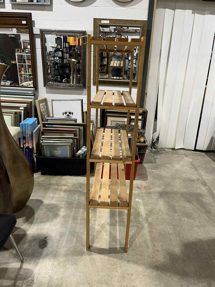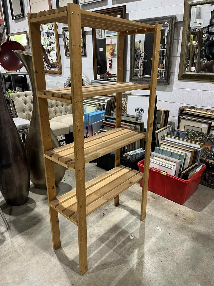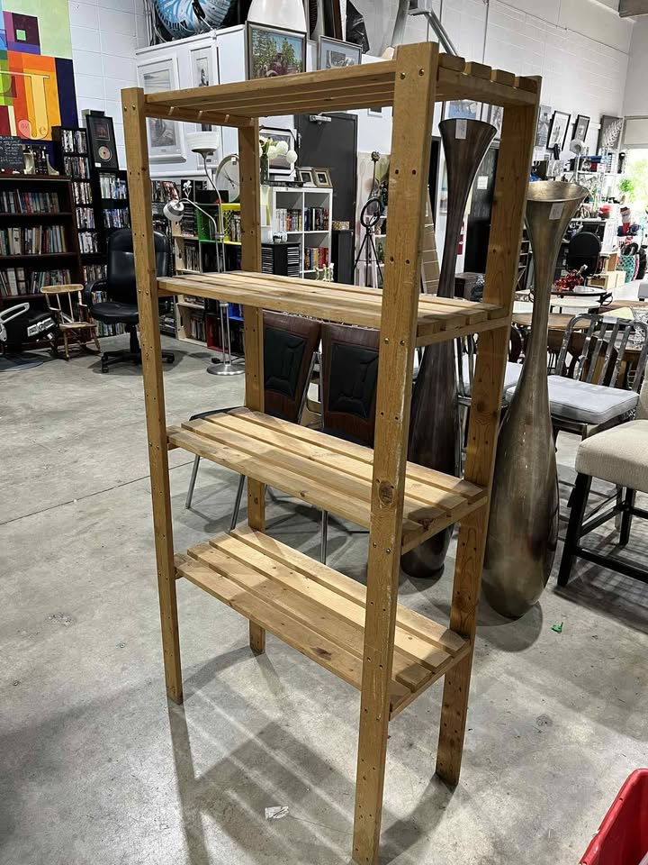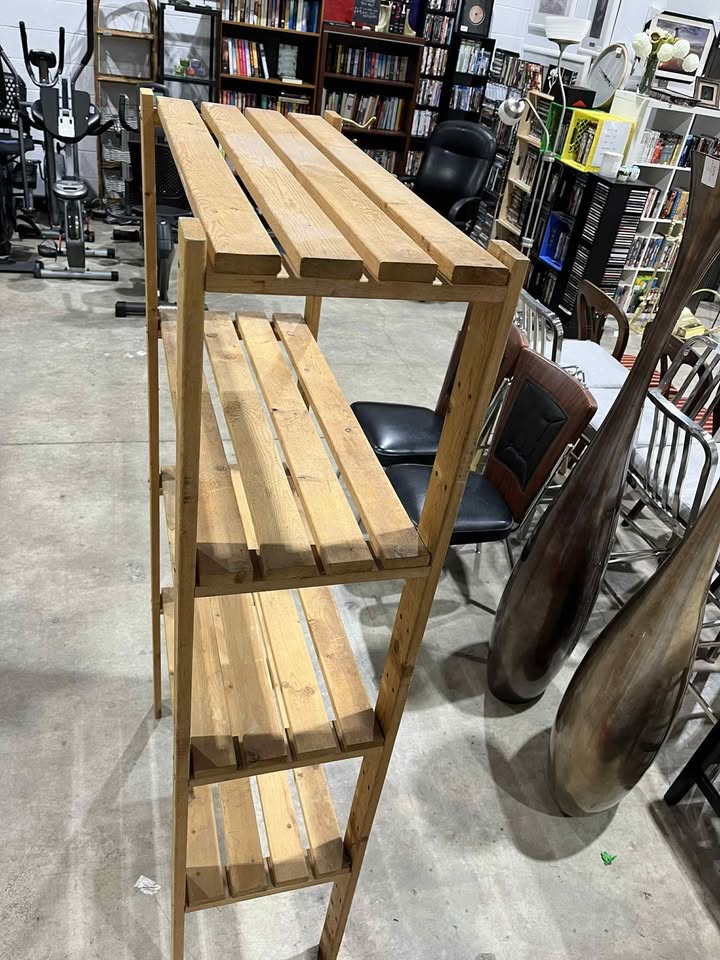 Wooden shelf unit with multiple shelves. Shelves have slatted design. Good for plants or books. You could create a small sanctuary in your home using this. Visit our Thrift Store Rebound Centre Located at 6215 3rd St SE - Unit C 11 Open everyday 10am - 5pm local pick up/delivery available (for a fee).