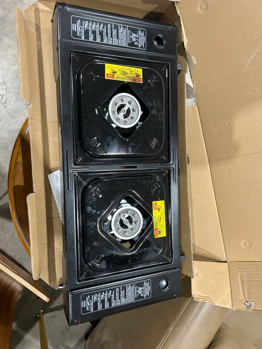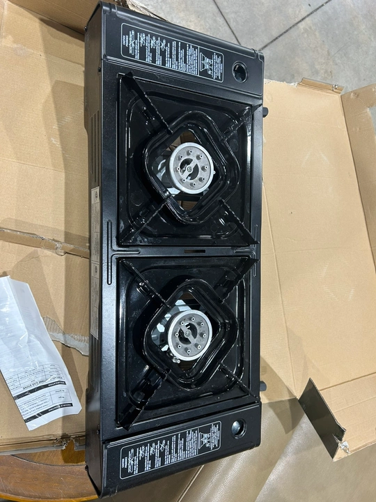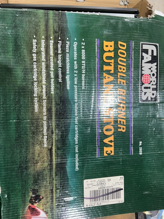 Portable double burner butane stove. Two 6000 BTU burners. Piezo matchless ignition. Flame height control. Enamel coated windshields around burners to protect flame. Safety gas cartridge locking system. Griddle and fuel not included.