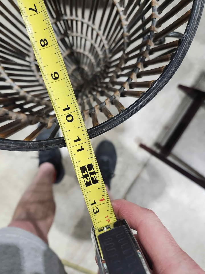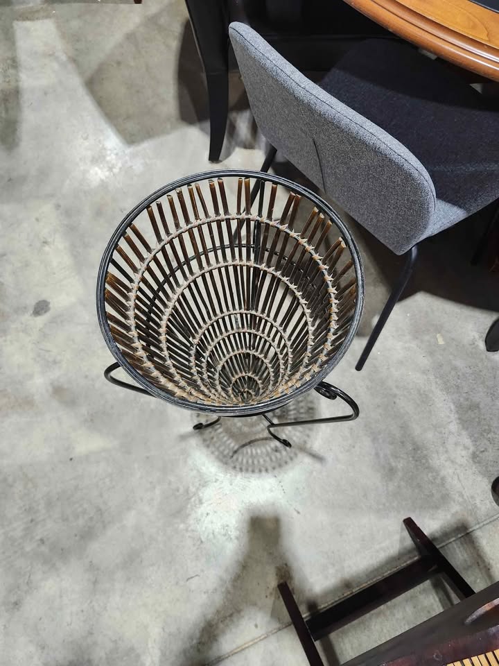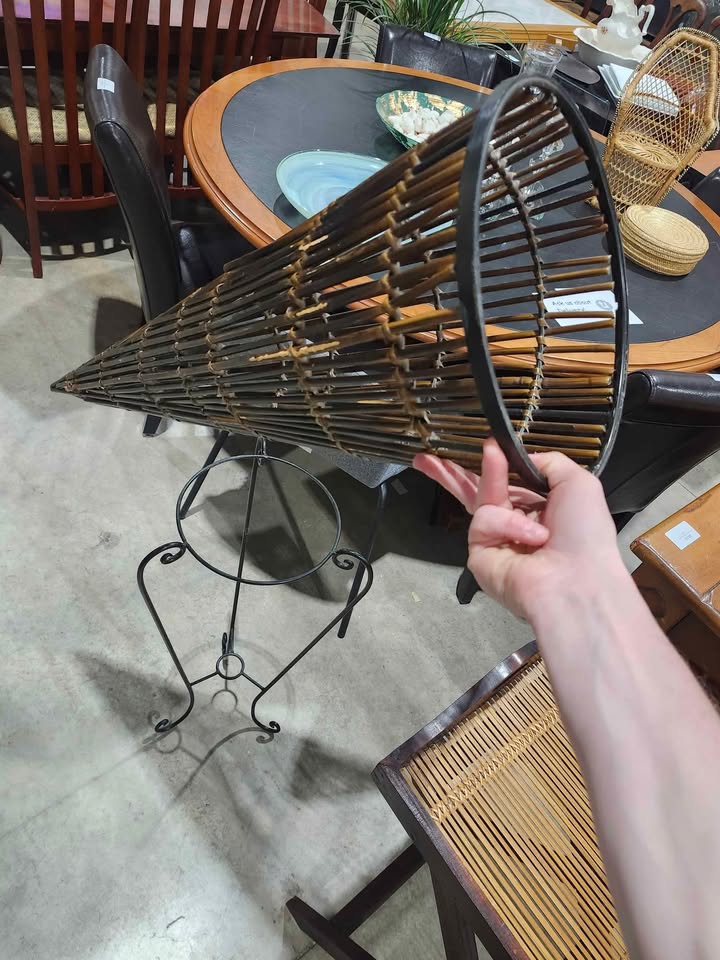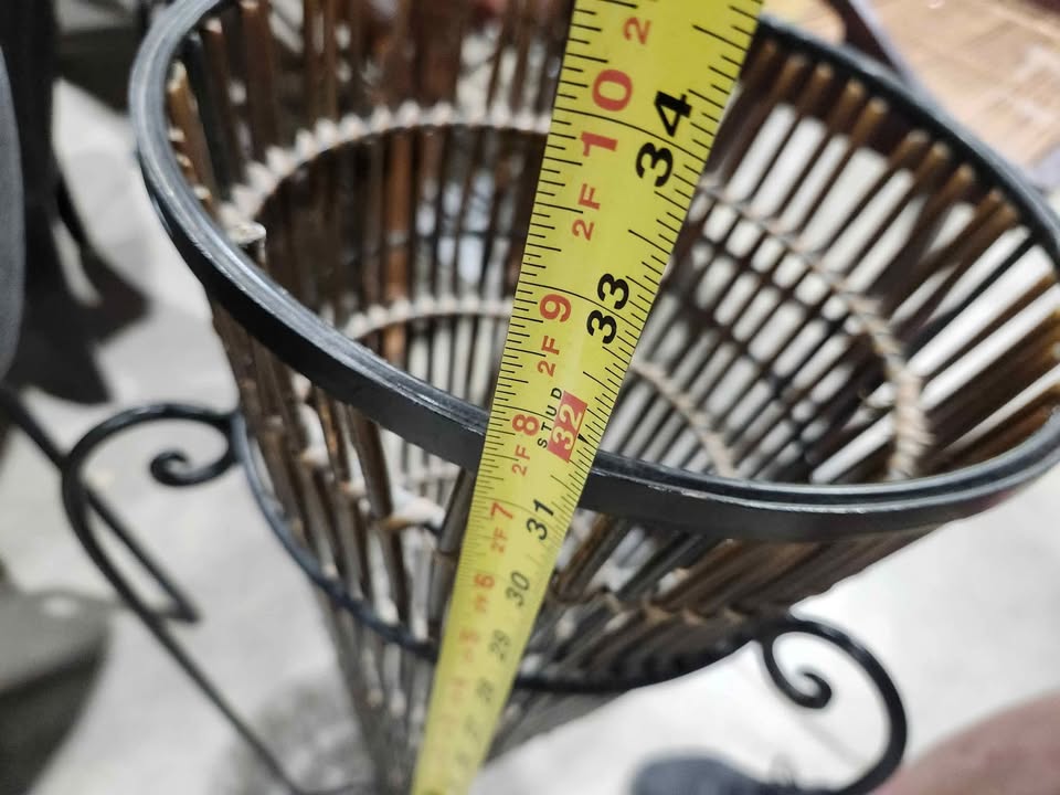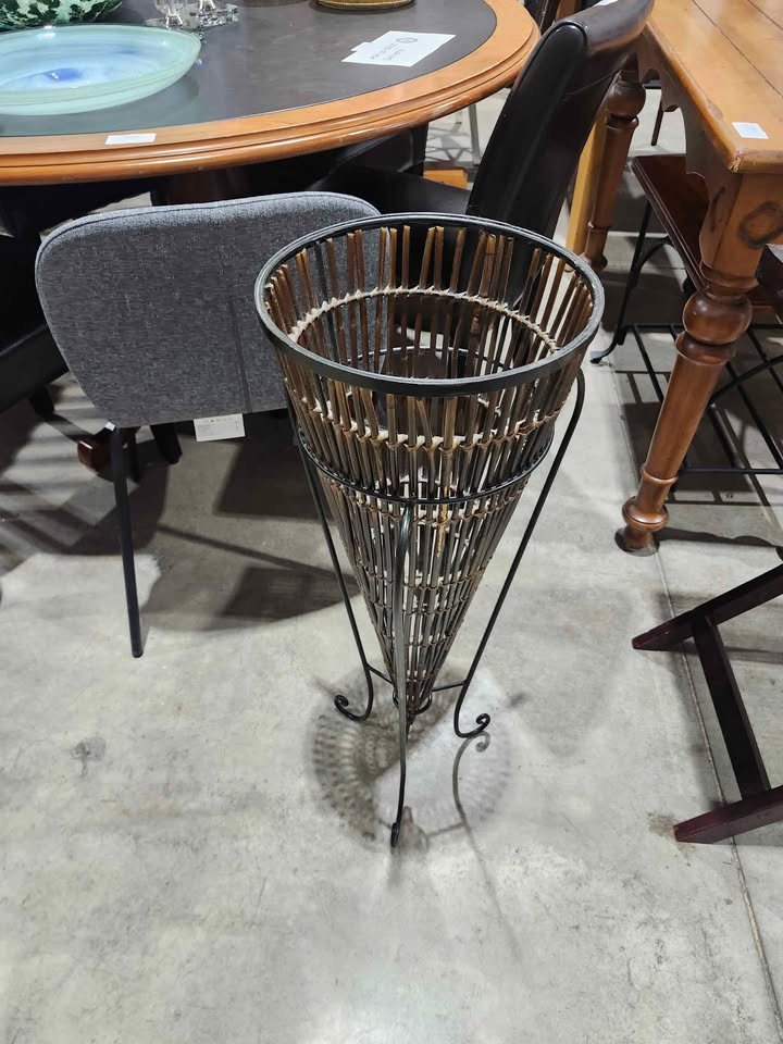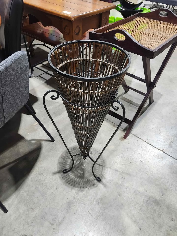 A tall decorative basket, made from woven wicker or possibly bamboo i am not 100% sure . The basket sits on a black metal stand. The stand features a decorative design. Display your favorite flowers in this beautiful piece to add an element of tranquility to your space. Visit Rebound Centre Thrift Store 6215 3rd St SE, Unit C11 Open daily 10 AM – 5 PM Local pickup/Delivery available Prices subject to GST