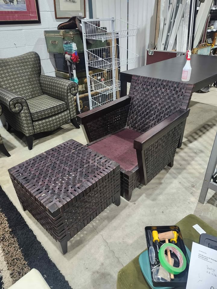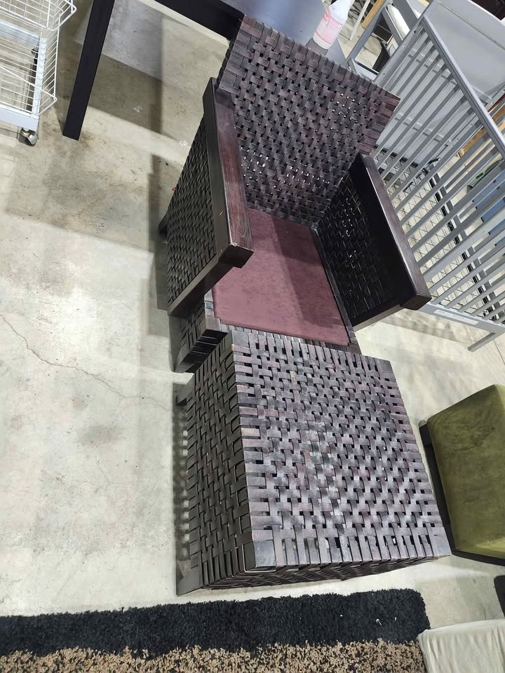 This stylish, used woven chair and ottoman set offers both comfort and unique design, perfect for enhancing any living space or outdoor area with a touch of artisanal flair. It doesn't have a bottom cushion but these are easy to come by.