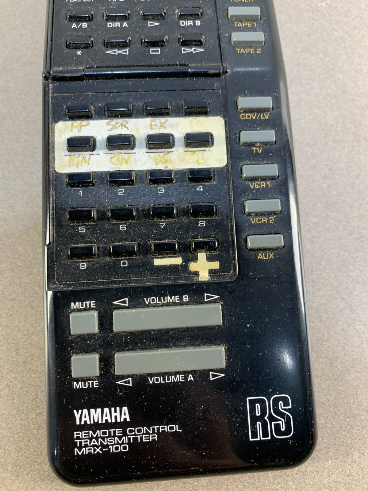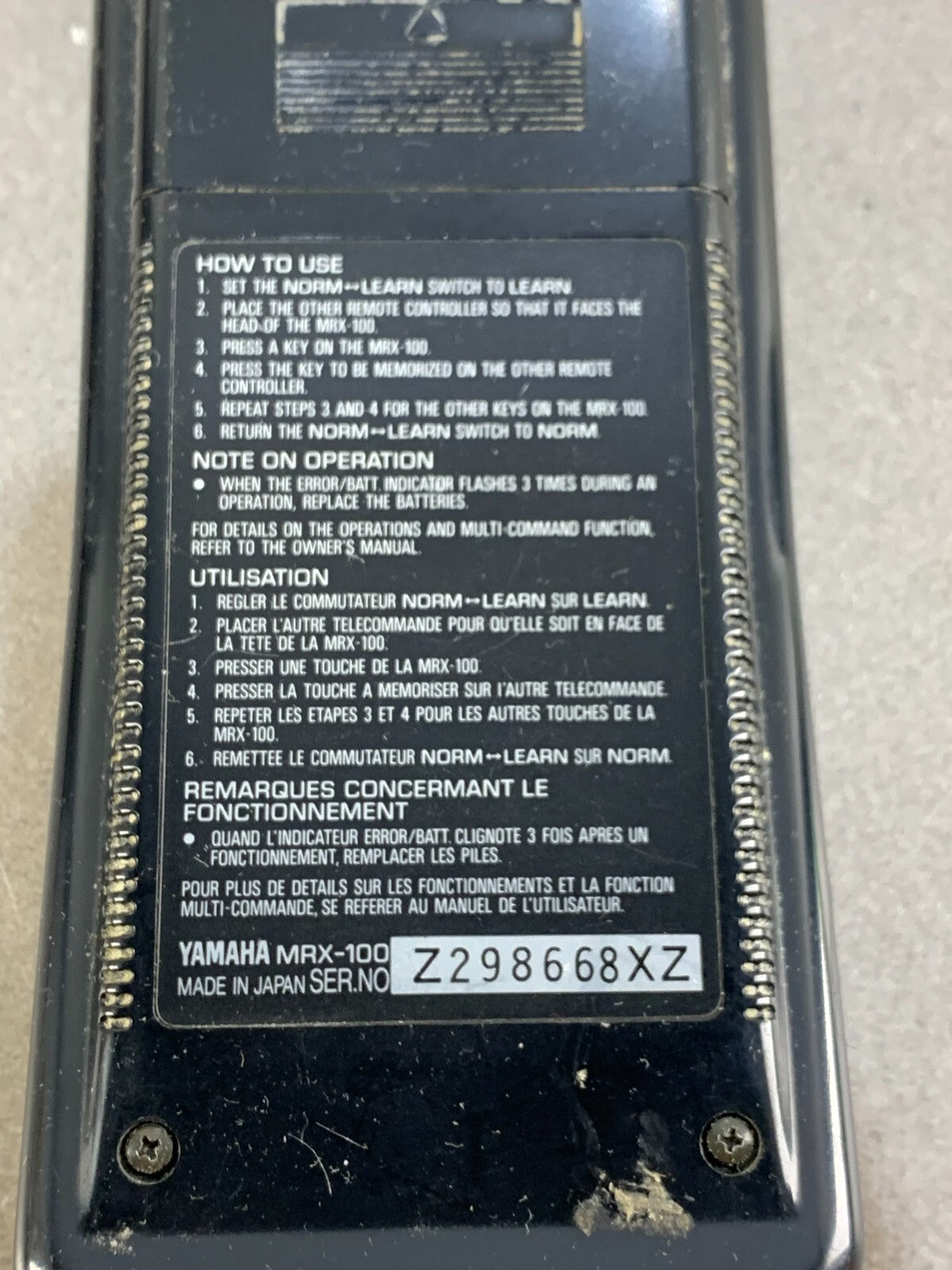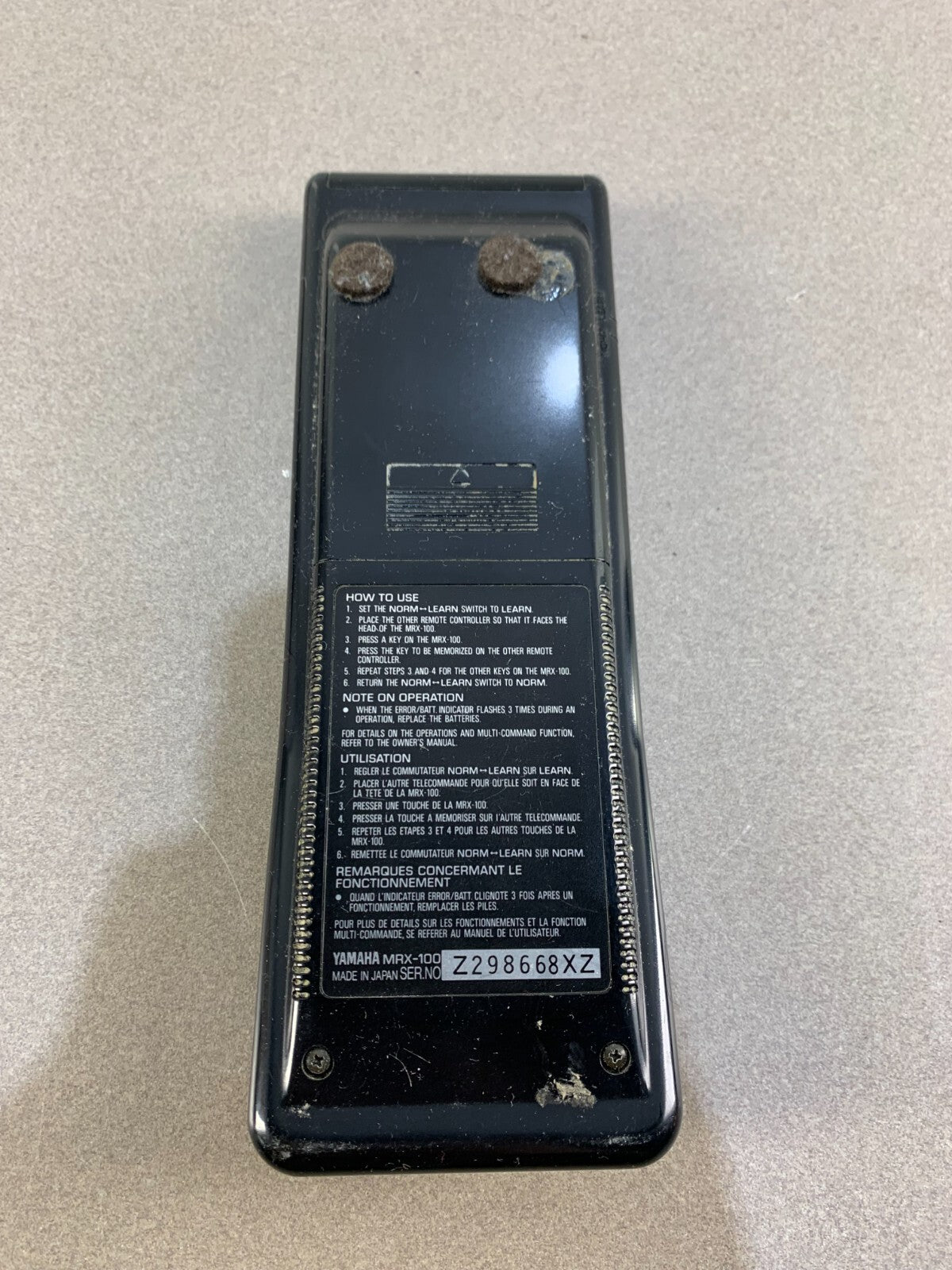 The Yamaha MRX-100 Remote Control Transmitter is a specific remote control designed for use with Yamaha audio equipment. It allows users to control various functions on their Yamaha devices from a distance. With its sleek design and user-friendly interface, the Yamaha MRX-100 provides convenience and ease of use for controlling audio settings and playback. Perfect for those looking to enhance their TV, video, or home audio experience with a reliable and high-quality remote control.