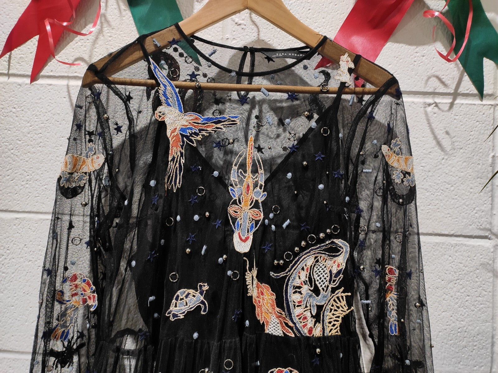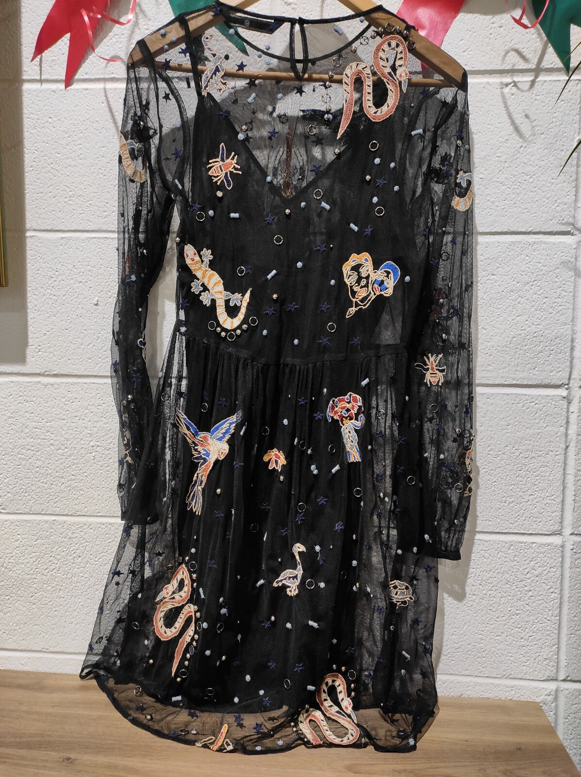 - Features an astrology-themed print, with celestial symbols such as stars, moons, and constellations, adding a mystical touch to the dress.