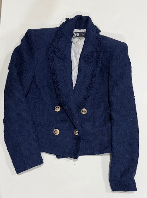 The Zara Blue Blazer is a stylish and versatile addition to any woman's wardrobe. This blazer is made of cotton, making it comfortable and breathable for everyday wear. The basic jacket style and XS size make it a perfect fit for a classic look. The blue color adds a pop of color to any outfit, making it a great choice for both casual and formal occasions.